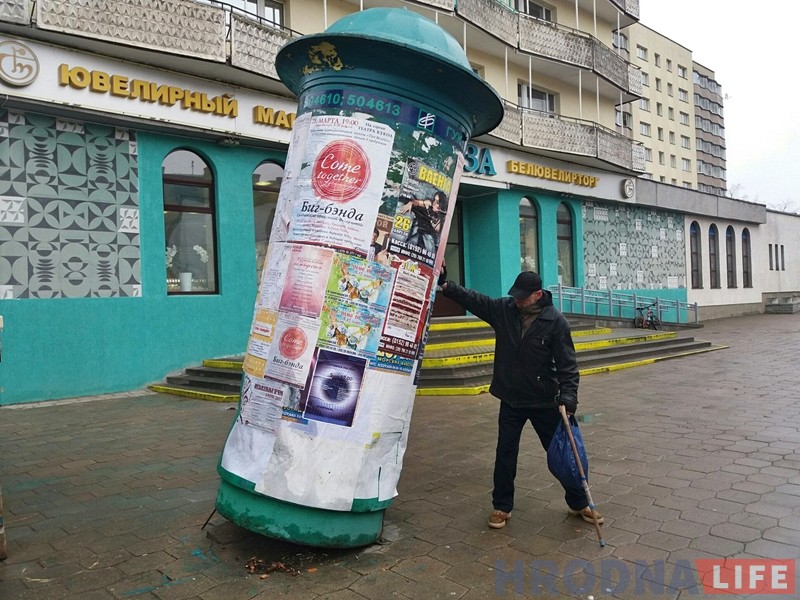 Раніцай 22 сакавіка стан тумбы для афіш на вуліцы Ажэшкi занепакоіў гродзенцаў. Тумба была нахіленая і ў любы момант магла ўпасці на людзей, якія праходзiлi побач.