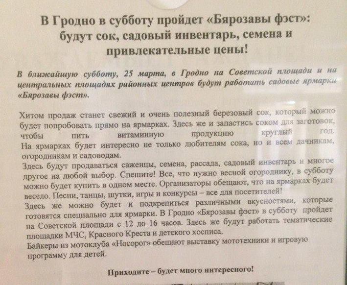 Адначасова зявіліся і аб’явы адб правядзенні ў Гродне  райцэнтрах кірмашоў “Бярозавы фэст”. На фестывалі анансуюць продаж бярозавіку, садовага інвентара, саджанцаў і рассады.  У Гродне кірмаш будзе праходзіць адначасова з дазволеным мітынгам, прысвечаным Дню Волі.