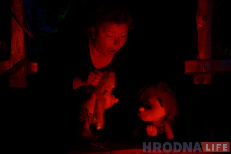 Марына Лазарава і Леанід Наркун з хатняга тэатра “Марья – искусница” з дапамогай лялек распавядаюць пра лад жыцця ў каменны век.