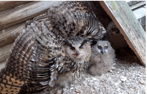Ушечка і Буш вельмі ўважлівыя і клапатлівыя бацькі. Мама корміць, грэе і ахоўвае малых, а тата з вышыні сочыць за тым, каб ніхто не пакрыўдзіў сямейства. Зняць гэтыя кадры было даволі складана – птушкі рэагуюць на найменшыя гук і рух. З-за гэтага вялікая частка здымкі вялася праз шкло назіральнага акенца.