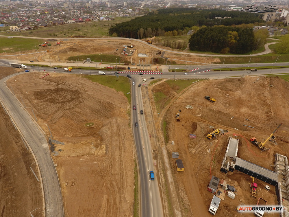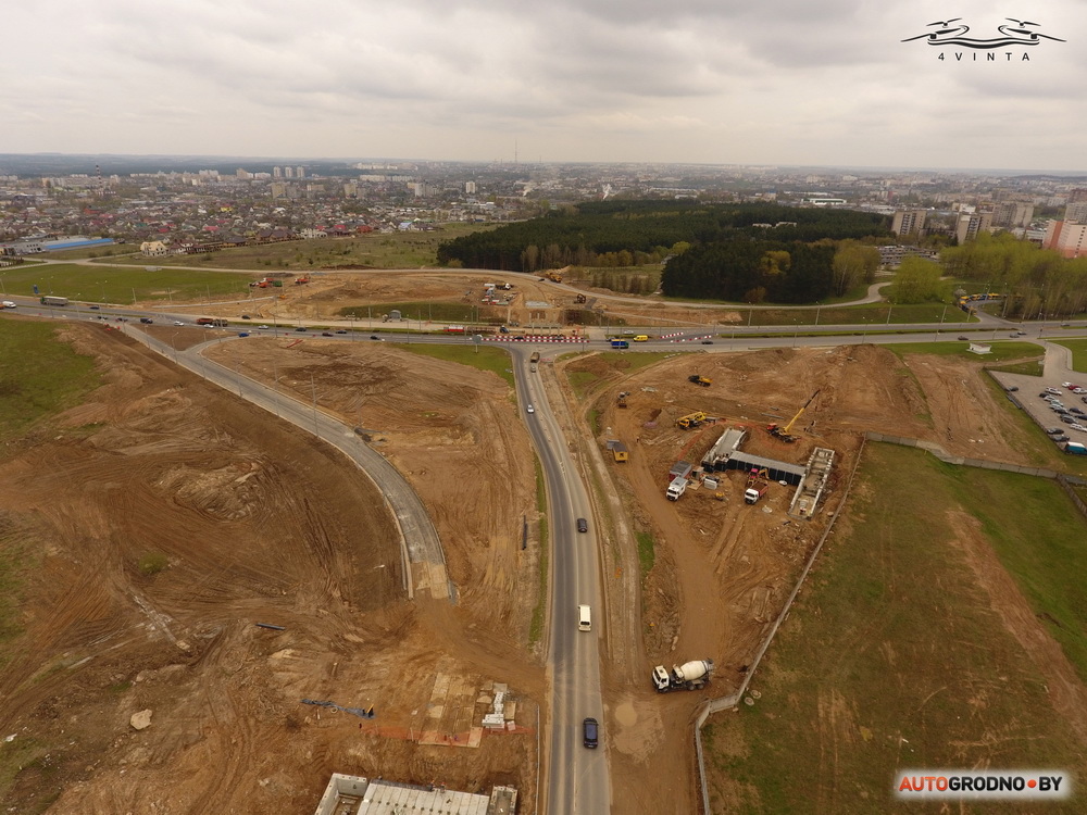 Дрон студыі 4vinta.by падняўся над будоўляй развязкі на выездзе з Альшанкі. На фотаздымках з вышыні 100 метраў відаць, як прасоўваецца дарожнае будаўніцтва. Фота апублікаваў autogrodno.by.