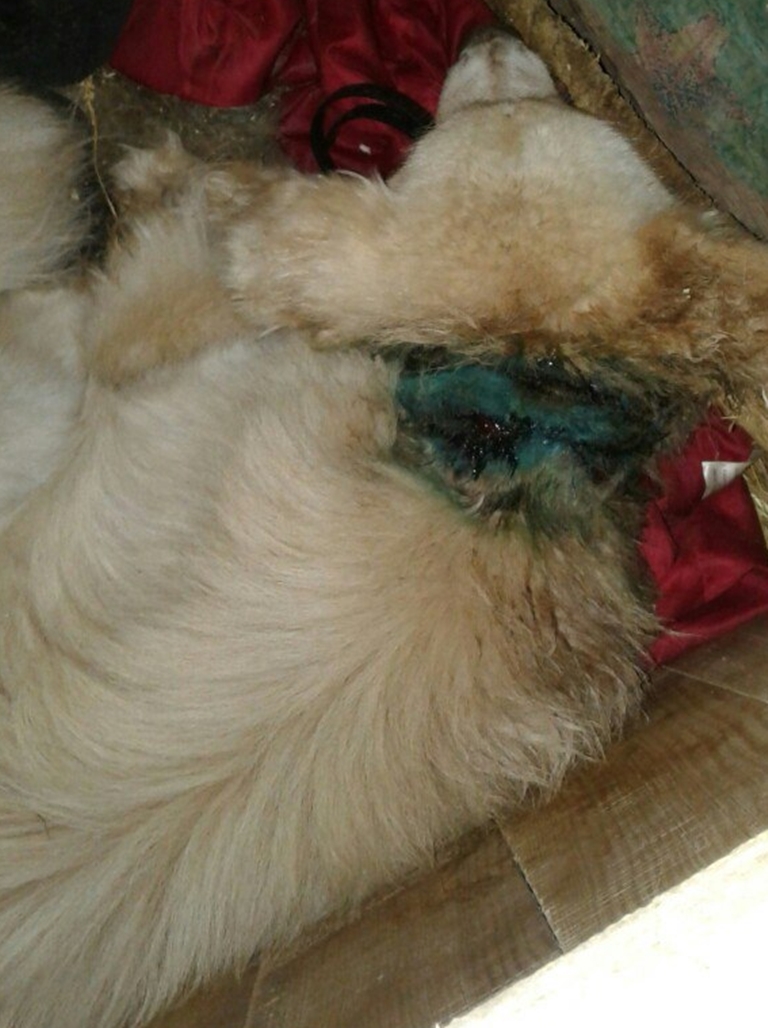 Акрамя вялікіх ран на шыі, у сабакі дэфармаваны хрыбетнік. Валанцёры адзначаюць, што жывёла ідзе на папраўку і хутка будзе бегаць. Пакуль сабаку лечаць у пункце часовага ўтрымання, але ў будучыні яго гатовыя аддаць у добрыя рукі, але толькі не тым гаспадарам, у якіх ён быў.