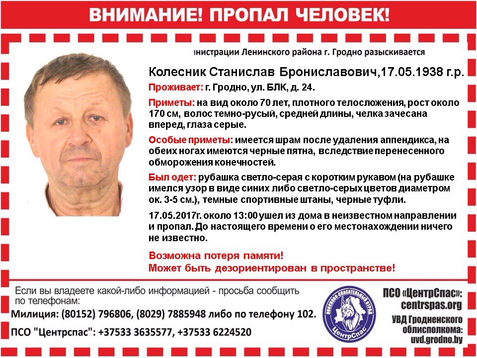 Пашукова-ратавальны атрад “ЦентрСпас” звяртаецца да гродзенцаў з просьбаў дапамагчы знайсці чалавека. Калеснік Станіслаў Браніслававіч, 1938года нараджэння, што жыве ў Гродне па адрасу БЛК, 24-40, 17 жніўня пакінуў месца жыхарства. Да гэтага часу яго месцазнаходжанне не ўстаноўлена. У сілу ўзросту і фізічнага стану ён мог страціць арыентацыю ў прасторы.
