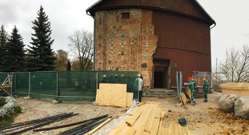 Унутры Каложскай царквы з’явілася часовая сцяна, а яе дах плануюць прыпадняць дамкратамі, піша grodnonews.by.