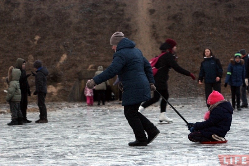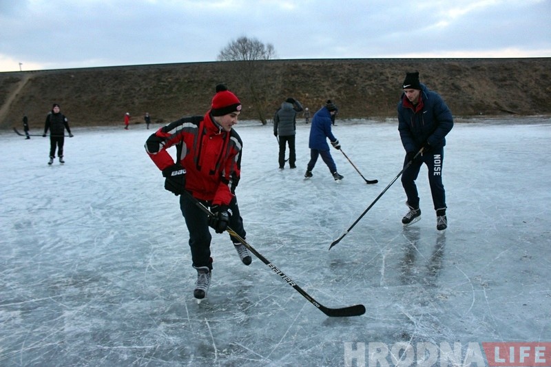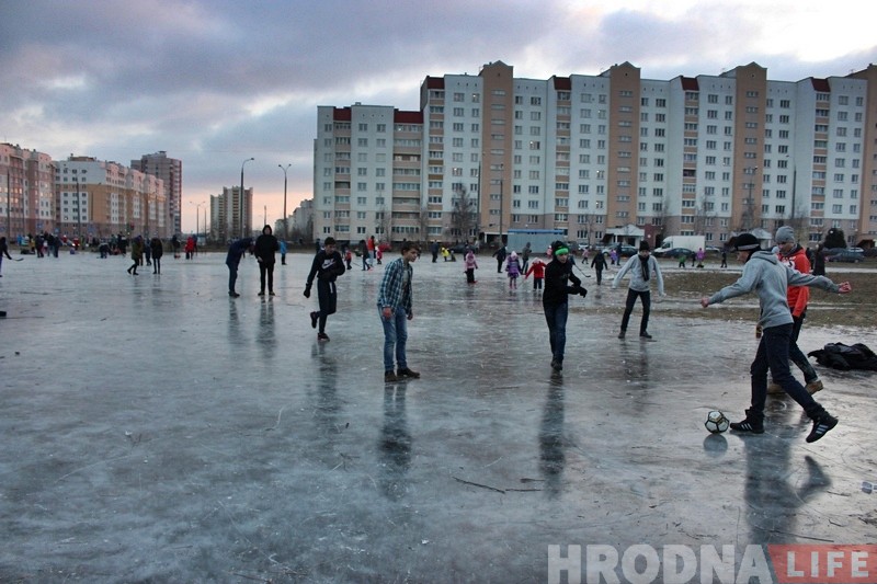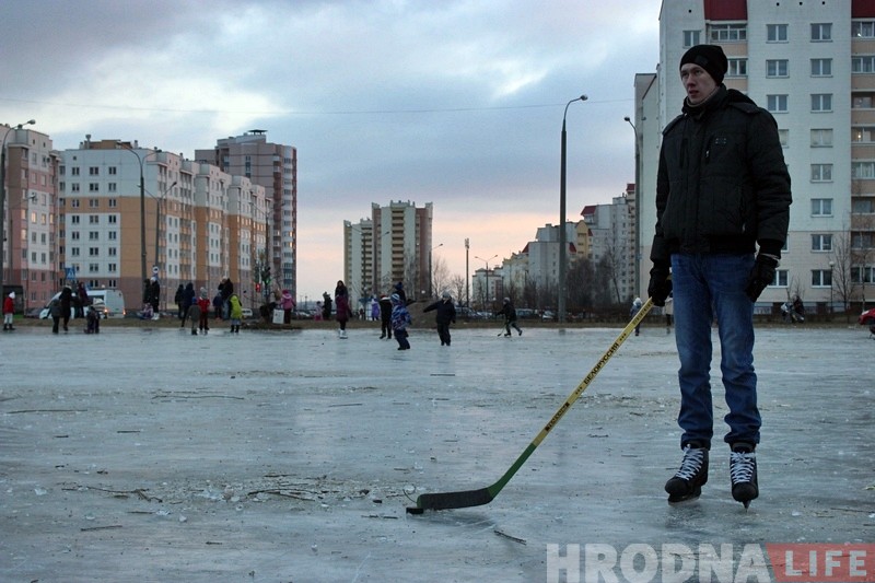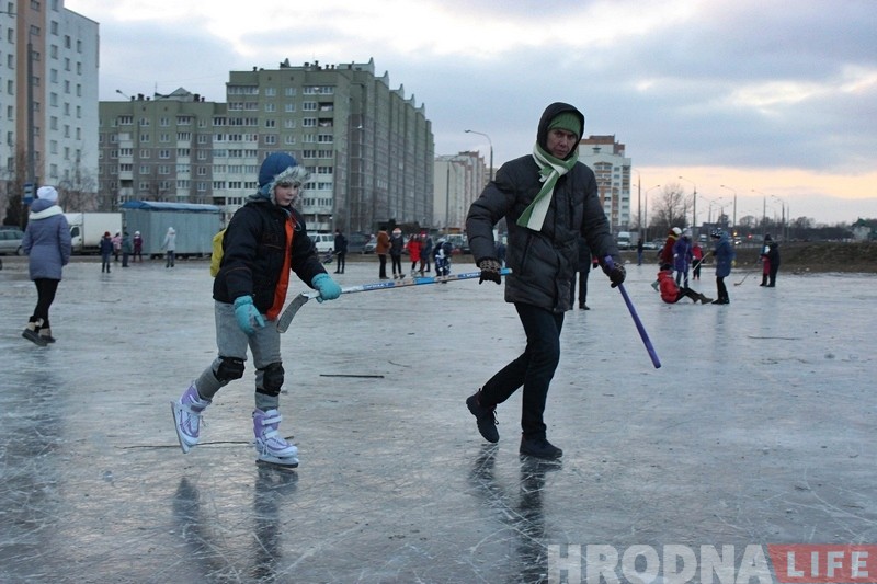 За мінулыя выхадныя лядовую пляцоўку ў мікрараёне наведала некалькі сотняў чалавек. З раніцы да вечара дарослыя і дзеці катаюцца там на каньках і санках, а таксама гуляюць у хакей і футбол.