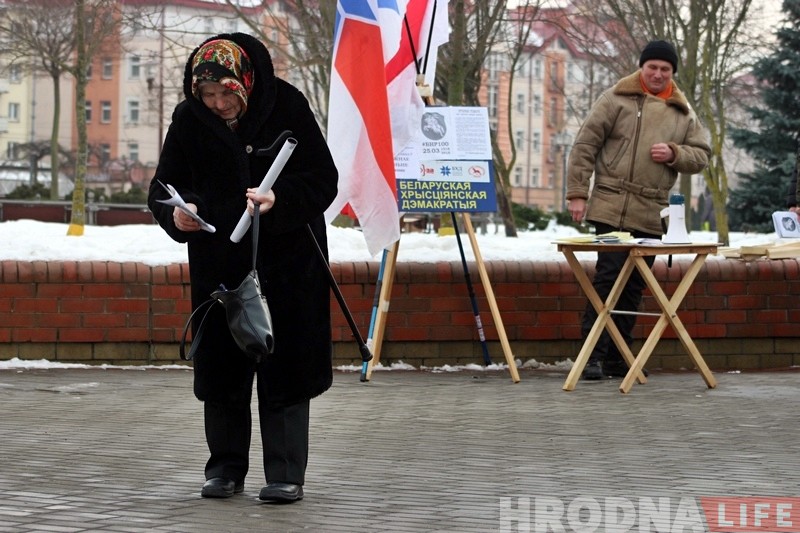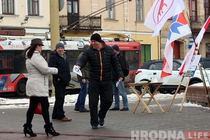 Прадстаўнікі Правацэнтрысцкай кааліцыі, у якую ўвоходзяць БХД, АГП і БНФ, 25 студзеня зладзілі перадвыбарчы пікет на Савецкай плошчы ў Гродне. Яны сабраліся, каб падтрымаць кандыдатку ў дэпутаты Бэлу Дашкіну. Адначасова яны скарысталіся пікетам, каб нагадаць гродзенцам пра надыходзячы юбілей – 100 год Беларускай Народнай Рэспубліцы.