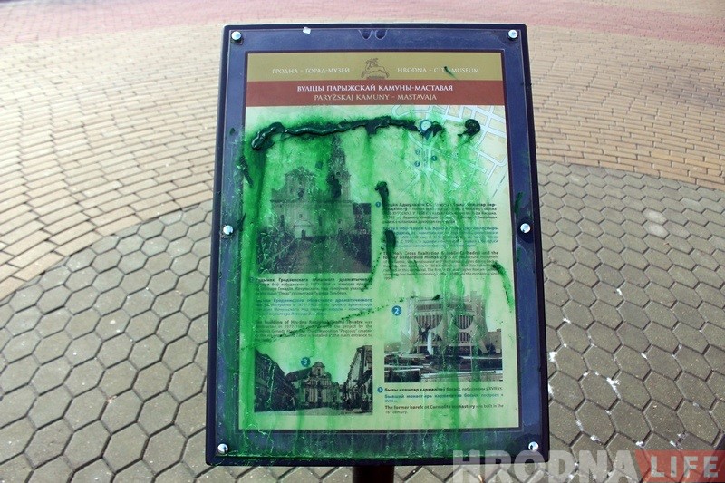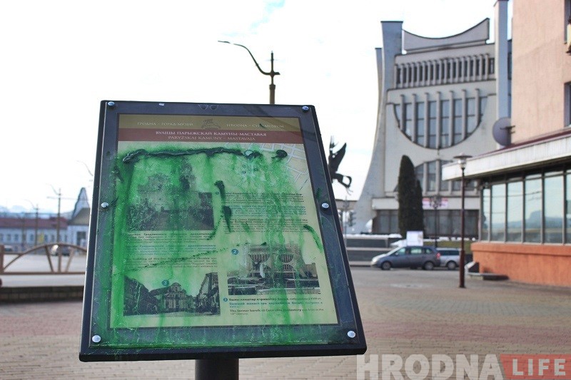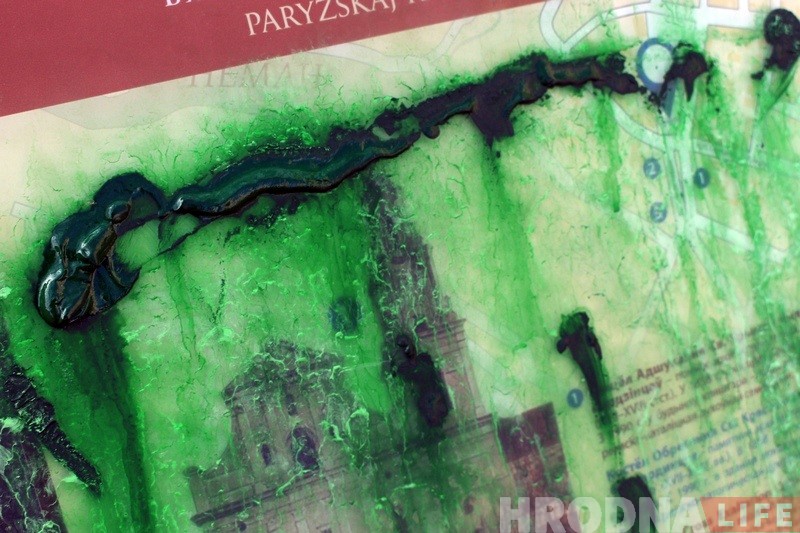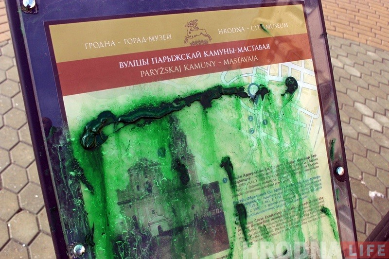 На вуліцы Маставой каля кнiжнай крамы «Ранiца» яшчэ на выходных невядомыя абмазалі зялёнай фарбай турыстычны стэнд, які быў усталяваны горадам 1 сакавіка 2017 года. Хто і навошта гэта зрабіў, невядома.