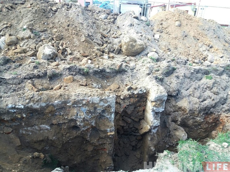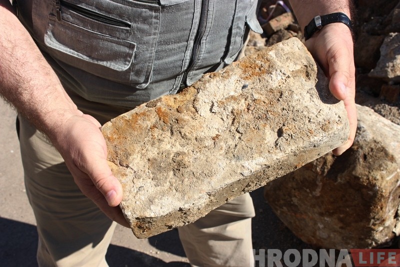 Ужо некалькі дзён побач з камяніцай па вуліцы Калючынскай, 23 вядзецца пракладка трубаправода і каналізацыі. Менавіта там рабочыя натыкнуліся на падмуркі старога дома, як аказалася – вельмі цікавага.