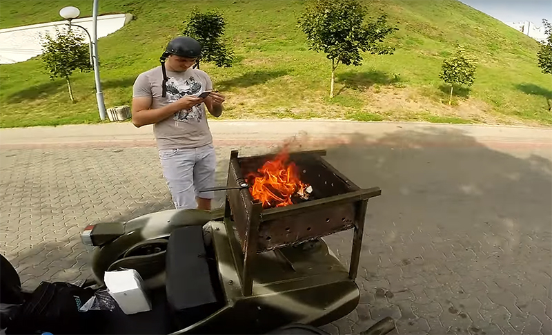 Яшчэ ў сярэдзіне жніўня ў Гродне два сябра на старэнькім матацыкле «Днепр» вырашылі прыгатаваць шашлык. Яны ўсталявалі мангал на вазок і сталі гатаваць мяса, пры гэтым раз’язджаючы па вуліцах горада. У пачатку верасня Гродзенская ДАІ адрэагавала на дзеянні гродзенцаў і выпісала штраф ўладальніку матацыкла.