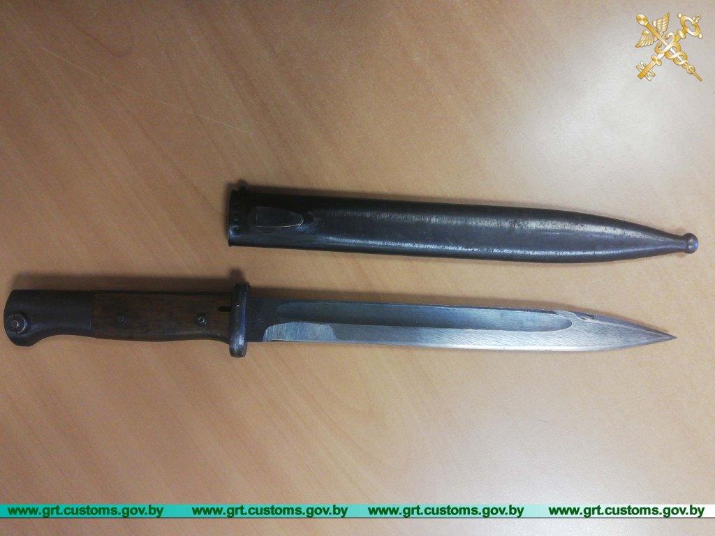 Паводле заключэння эксперта Мытнай лабараторыі, прадмет з’яўляецца нямецкім штык-нажом 1884-1898 гг., уяўляе культурную каштоўнасць і адносіцца да катэгорыі халоднай зброі колюча-рэжучага дзеяння. Перамяшчэнне праз мытную мяжу такой халоднай клінковай зброі забаронена.