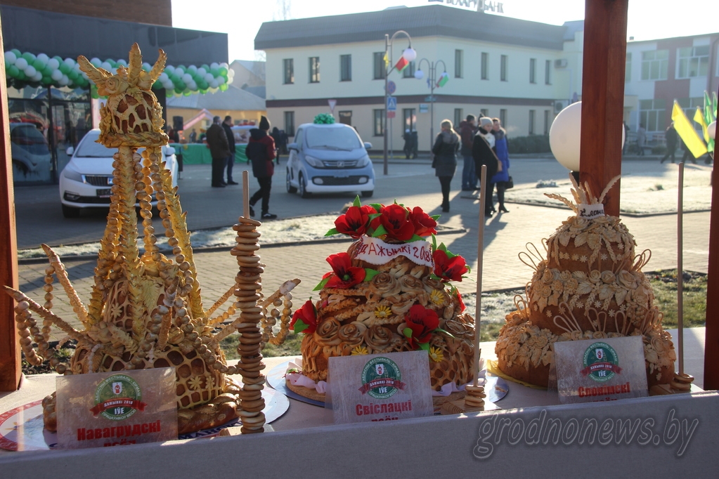 Конкурсныя караваі з разнастайнай аздобай, батонавае дрэва, жанчына-стол, інсталяцыі з яблык і гарбузоў, бульбяны конь і скокі з караваямі – “Дажынкі” пакрысе ператвараюцца ў адмысловы фэст ежа-арту. Канешне не абышлося і без звыклых ужо для афіцыйных “Дажынак” скульптур – саламяных лялек з пукатымі вачыма, дзедаў ды бабак на вазах і г.д. Глядзім падборку фота, як гэта было сёння ў Іўі.