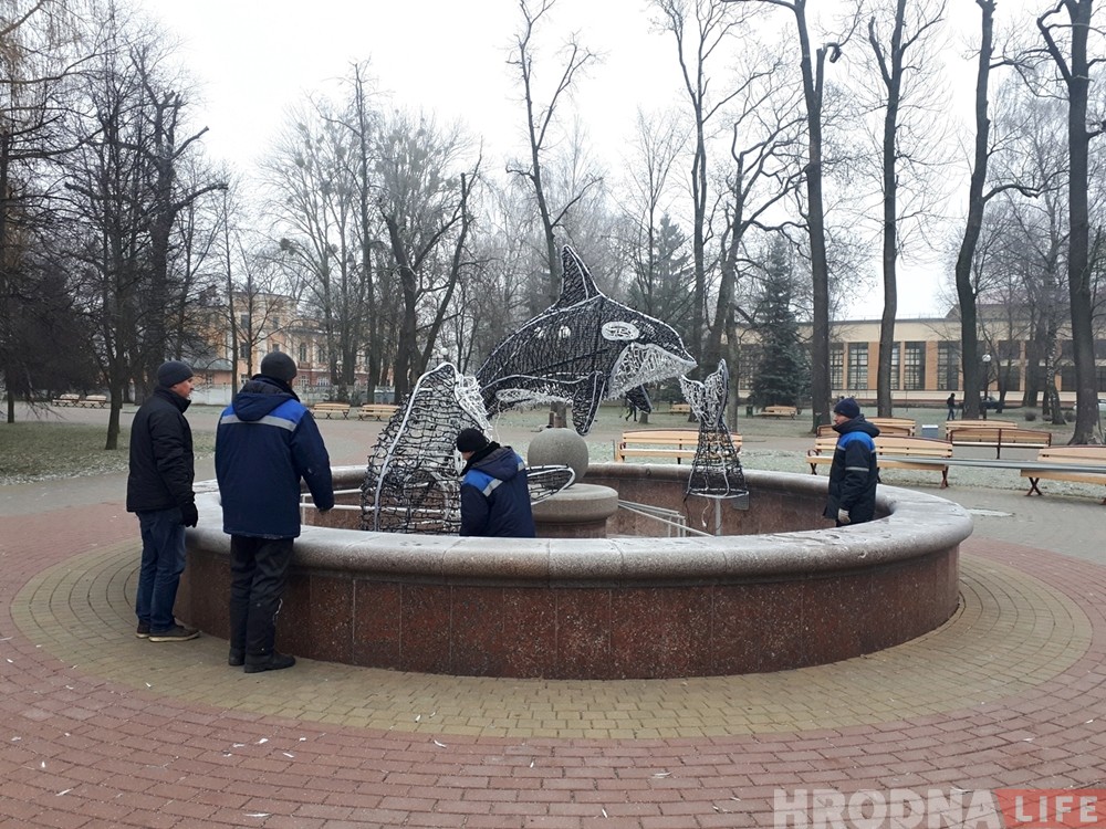 Супрацоўнікі “Гарсвятла” ўсталёўваюць навагоднюю ілюмінацыю ў Гродне. Ужо 6 снежня новыя светлавыя дэкарацыі з’явіліся на плошчы Леніна і ў парку Жылібера. Тут стары фантан ўпрыгожваюць касаткі, якія ныраюць у ваду.