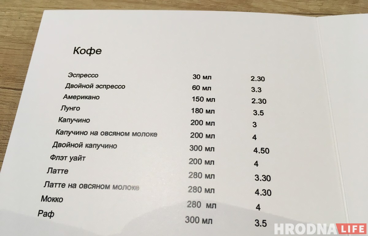 У кавярні можна будзе пакаштаваць каву з зерня 100% арабікі. Апроч класічных эспрэса, амерыкана, раф і капучына гасцям прапануюць латэ на аўсяным малацэ. Навінкай для Гродна стане кава з тэкілай.