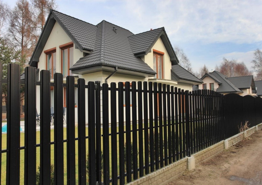 Во-первых, привлекает его долговечность – по сравнению с другими материалами его изготавливают из стали толщиной не менее 5 мм. При этом возможны варианты как односторонней, так и двухсторонней облицовки. В первом случае на каркасе фиксируются жесткие пластины лишь с одной стороны – лицевой, внутренняя же остается менее эстетичной. Во втором случае и с внешней, и с внутренней стороны ограждение выглядит презентабельно, так как перекладины скрыты под штакетником.