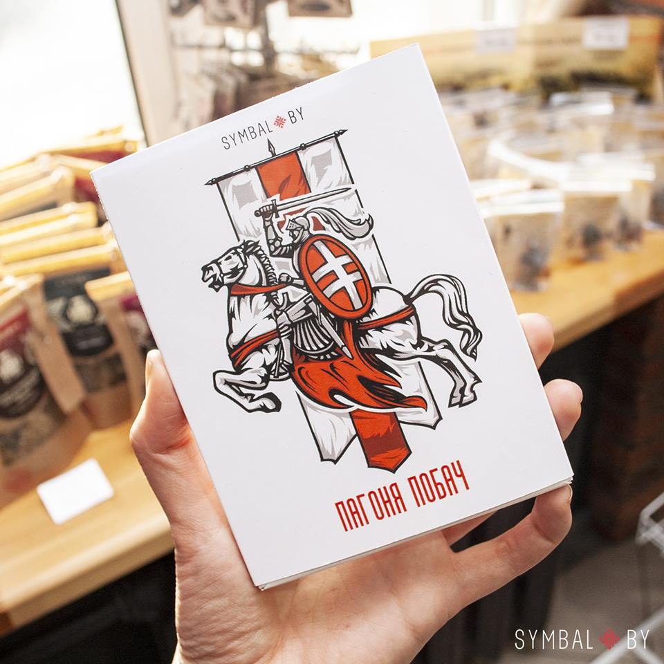 Сувенірны набор шакаладак «Пагоня побач», упрыгожаных выявамі герба «Пагоня» розных часоў, з’явіўся ў продажы 22 лютага. Ён стаў вынікам супрацы крамы Symbal.by з кампаніяй «Каралева Агню груп» і кандытарскай фабрыкай «Спартак». У сувенірную каробку запакавана 12 малочных шакаладак з утрыманнем какава-прадуктаў 32%. Агульная вага цукерак ва ўпакоўцы – 60 грамаў. На зваротным боку апакавання прыведзена гісторыя галоўнага дзяржаўнага сімвала Беларусі – “Пагоні”.