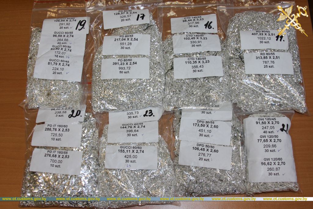 Каштоўнасці меў намер перанесьці з Польшчы праз пункт пропуску “Брузгі” грамадзянін Рэспублікі Беларусь. Ювелірныя вырабы ў 63 поліэтыленавых ўпакоўках былі схаваныя ад мытнага кантролю ў схованках, абсталяваных у рулявым коле і панэлі кіравання аўтамабіля «Honda Civic». Усяго выяўлена 2 266 бранзалетаў і ланцужкоў.