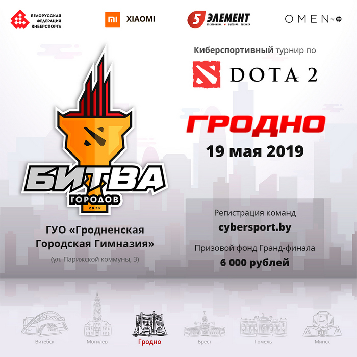 Беларуская федэрацыя кіберспорту сумесна з сеткай магазінаў “5 элемент” абвясціла аб правядзенні трэцяга этапу рэгіянальнай серыі “Бітва гарадоў”. Пасля Віцебска і Магілёва турнір у дысцыпліне Dota 2 прыме Гродна. Чэмпіянат ужо паспеў зарэкамендаваць сябе як адна з найбуйнейшых кіберспартыўных падзей краіны, піша www.pressball.by.