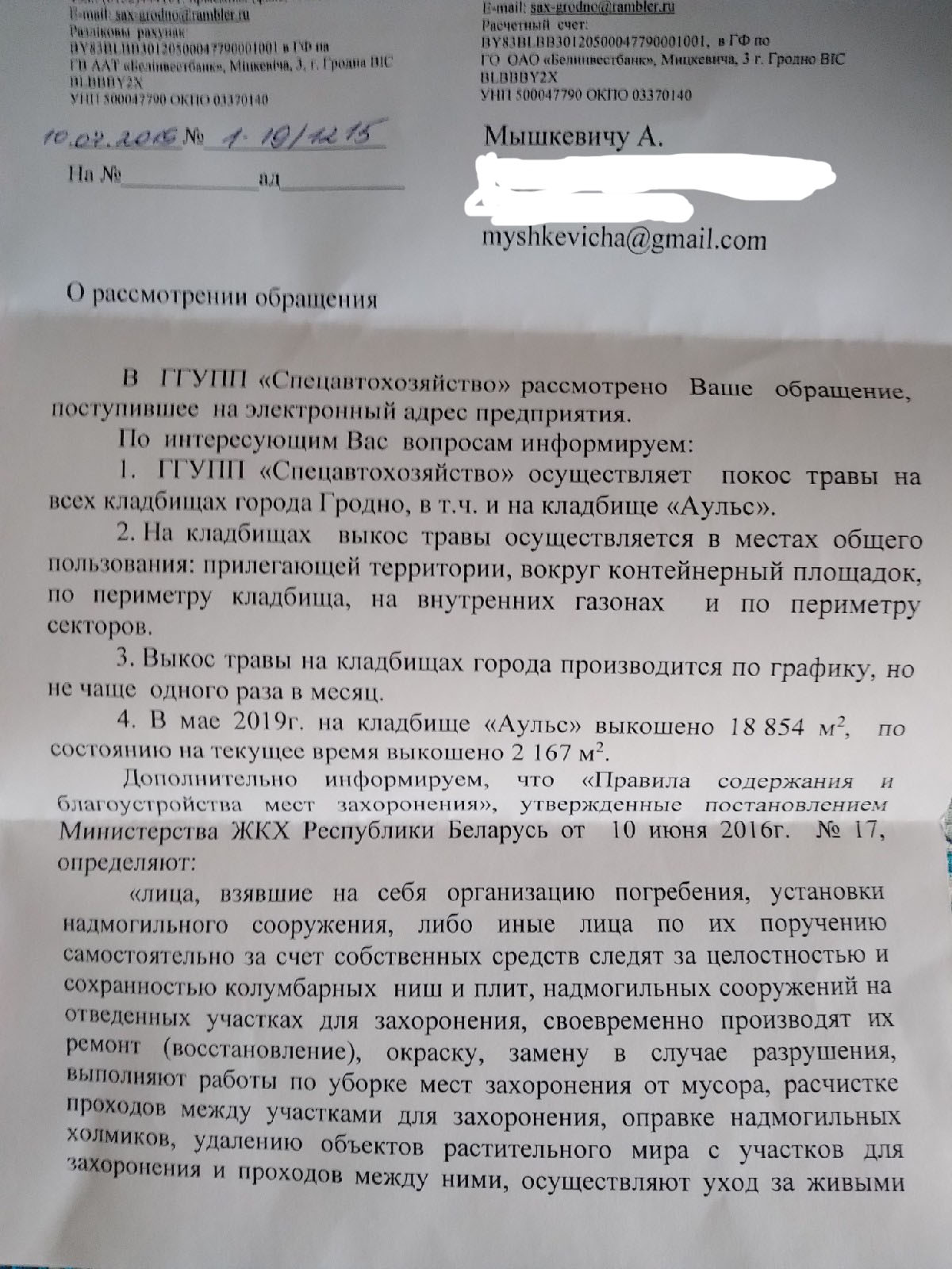 Гродзенскі актывіст Анатоль Мышкевіч занепакоіўся станам могілак Аульс. Ён туды прыязджае на магілы родных і кажа, што ўвесь летні сезон там велізарныя зараслі, якія не косяць. Анатоль адправіў запыт у Спецаўтагаспадарку, каб яны адказалі, як часта і хто павінен касіць.