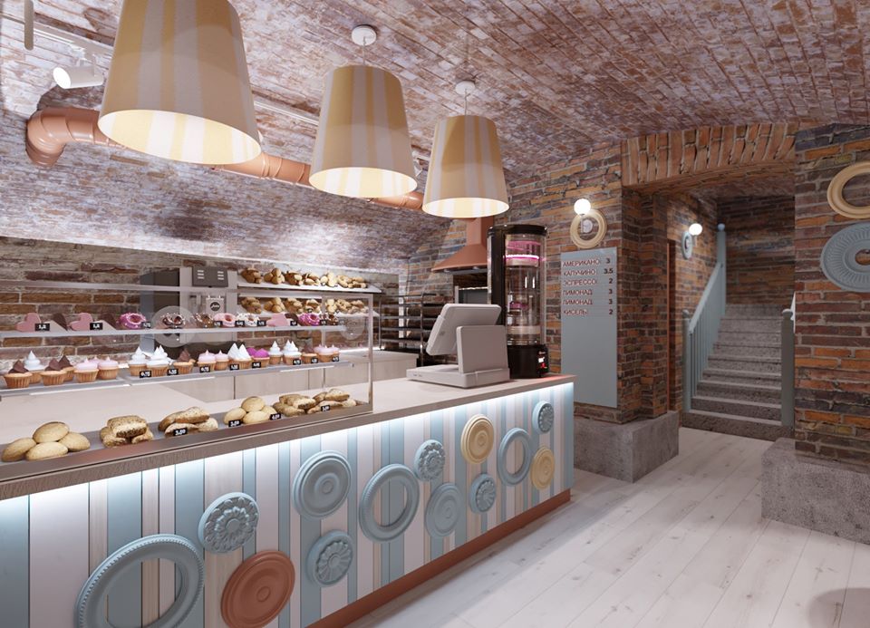 Мы сделали проект кафе-пекарни, где можно будет купить вкусную выпечку, посидеть и выпить чашку горячего чая или кофе. Основной запрос от хозяев кафе-пекарни был такой: чтобы стало “вкусно”, светло, хотелось находиться, оставаться, кушать и возвращаться