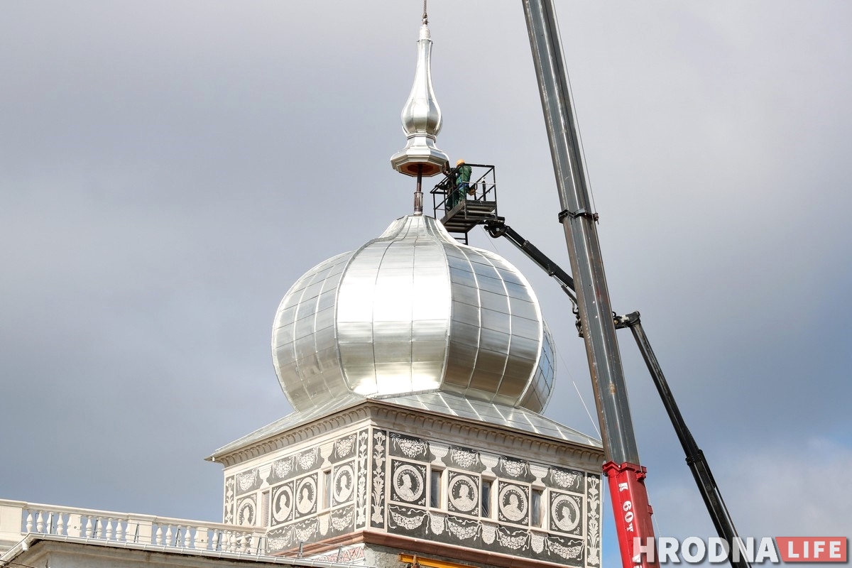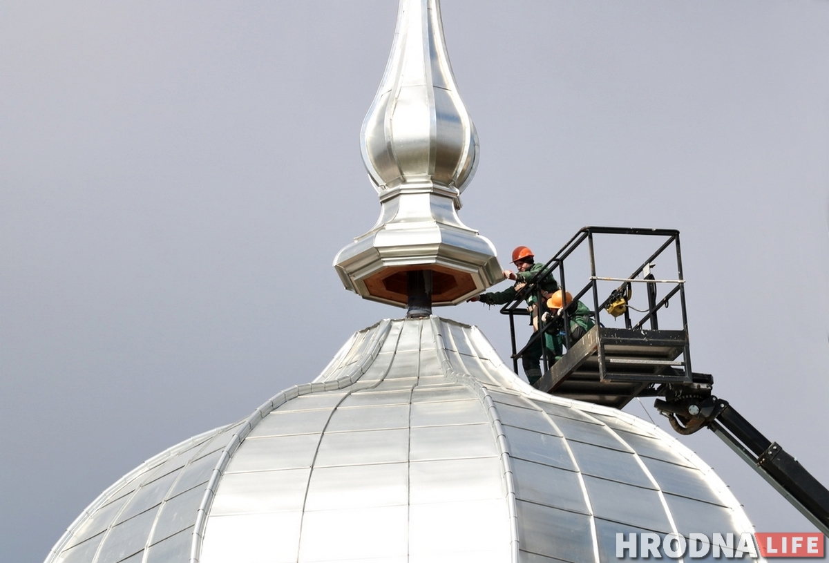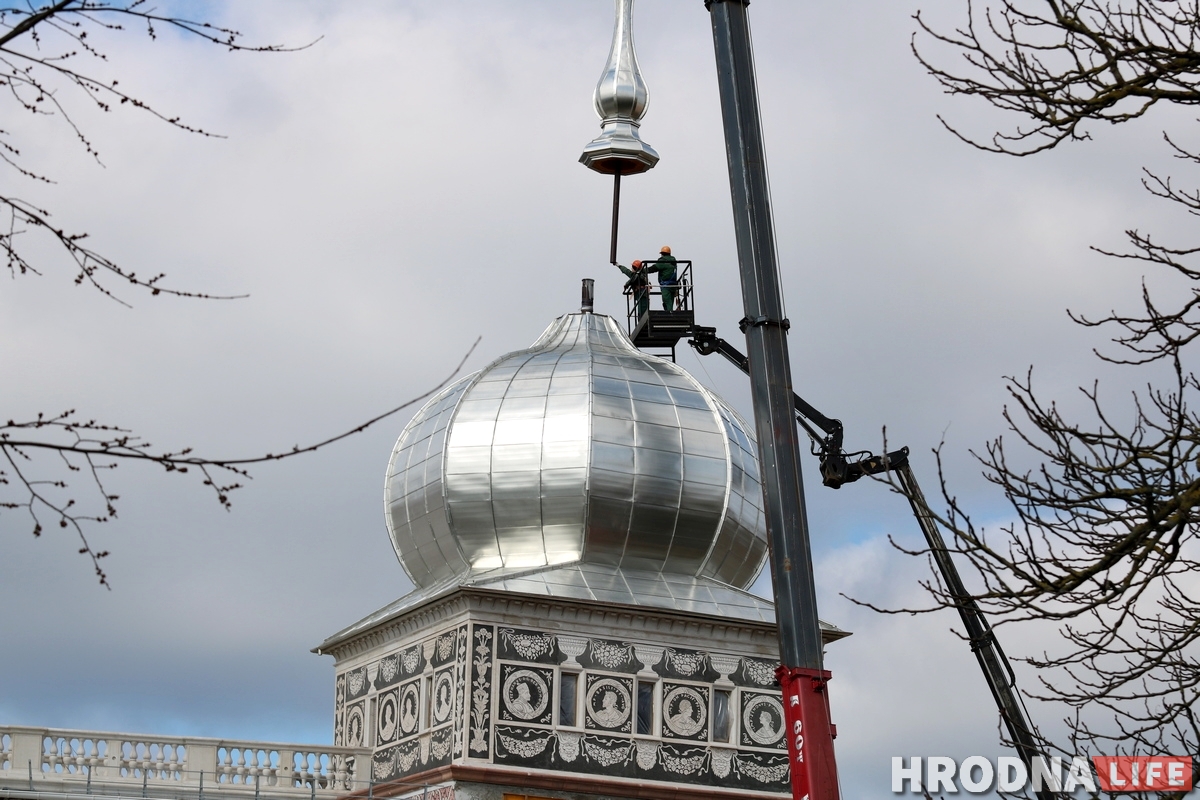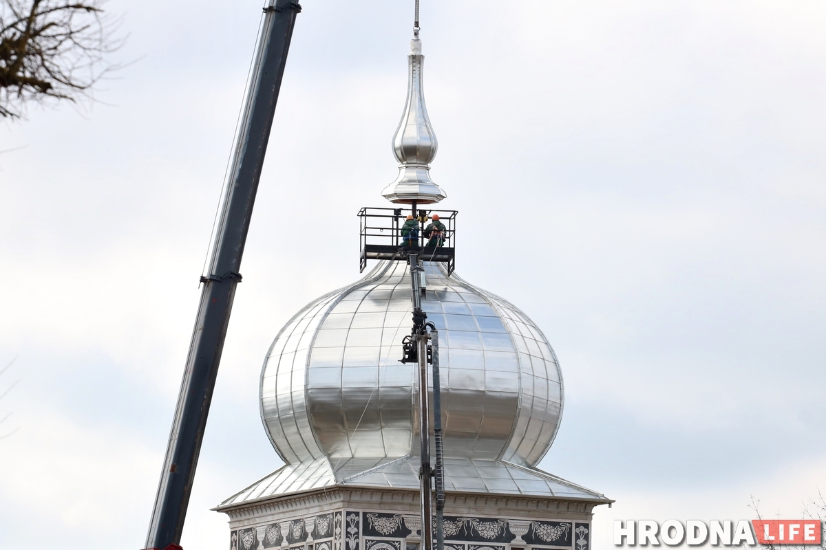 У аўторак 17 сакавіка на купал уязной вежы Старога замка паставілі шпіль. Ужо можна ўбачыць, як гэта выглядае цалкам.