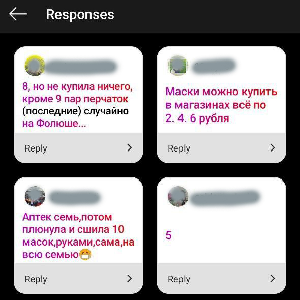 Астатнім, менш прадбачлівым, пашанцавала менш. У сярэднім нашы чытачы ў Instagram абыходзілі 6 аптэк перш чым знаходзілі патрэбны тавар. Некаторыя не знайшлі наогул. Адна з чытачак абыйшла 8 аптэк, але «не купіла нічога, акрамя 9 пар пальчатак (апошнія) выпадкова на Фолюшы”.