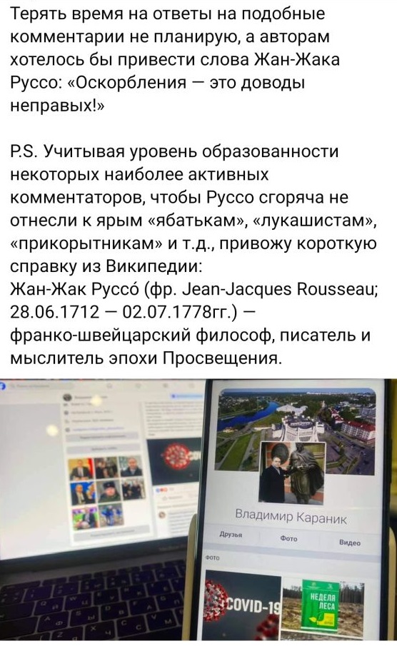 “Для мяне сучасныя інфармацыйныя тэхналогіі – гэта працяг рэальнага жыцця, але ніяк не яго замена. Я быў здзіўлены, што для некаторых віртуальнае жыццё стала галоўным, часам цалкам падмяніўшы рэальнае. Таму адразу акцэнтую, што я заходжу ў Facebook для размяшчэння цікавай і карыснай, з майго пункту гледжання, інфармацыі аб рэальным свеце, а не ў імкненні ўцячы ад яго, як гэта, па маім назіранні, робяць многія з сталых наведвальнікаў “.