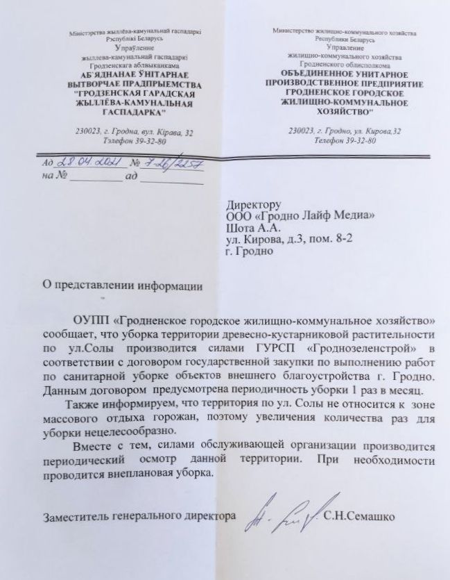 Праводзіць уборку каля крыніцы на вуліцы Солы часцей, чым раз у месяц, немэтазгодна, растлумачыў намеснік дырэктара Гродзенскай гарадской ЖКГ Сяргей Сямашка ў адказе ад 28 красавіка 2021 года. Гэта звязана з тым, што месца не адносіцца да зоны масавага адпачынку гараджан. Разам з тым камунальнікі перыядычна аглядаюць гэтую тэрыторыю і пры неабходнасці праводзяць пазапланавую ўборку, адзначае Сямашка.