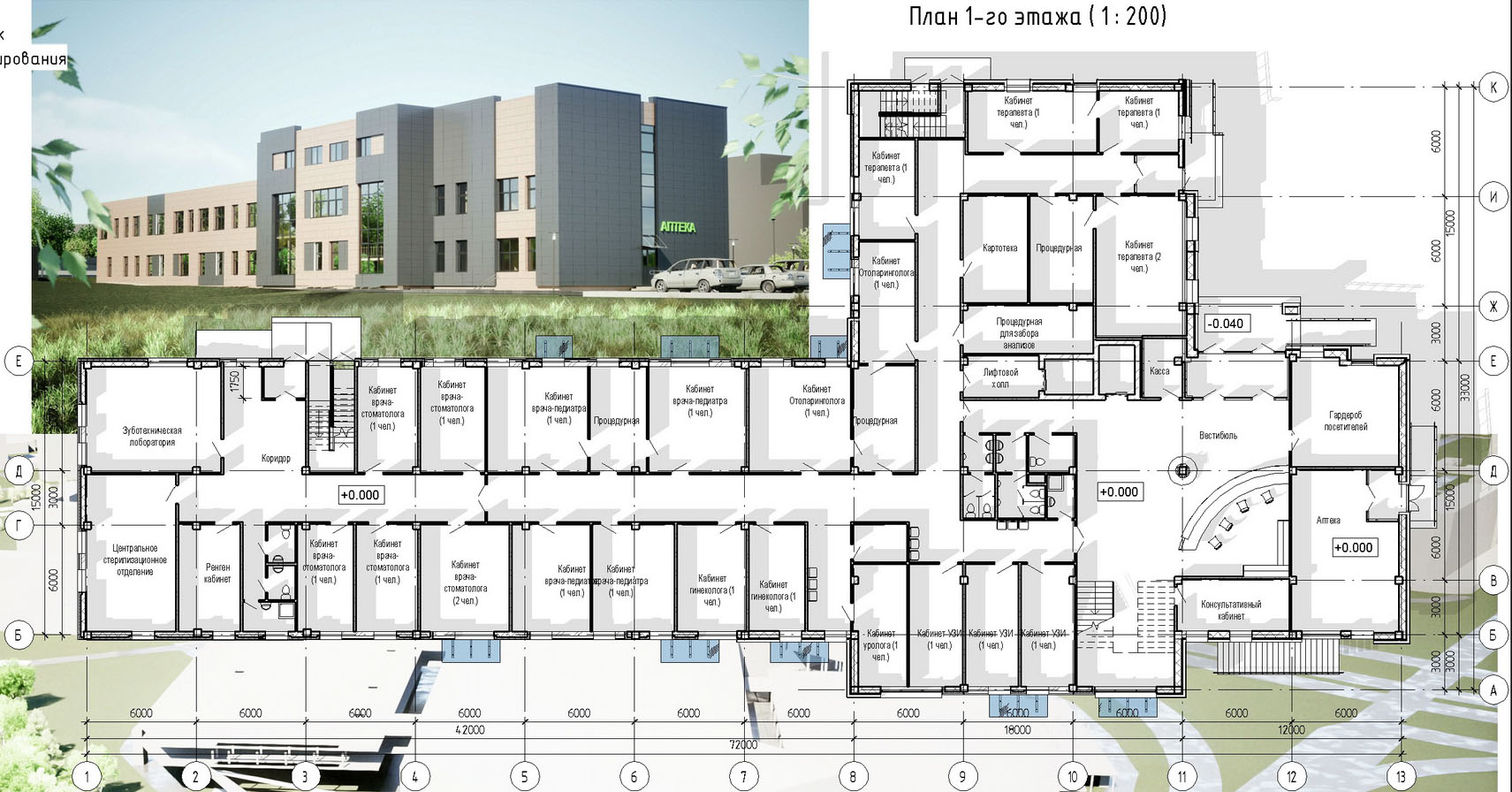 На першым паверсе ў вестыбюлі размесцяць зону рэцэпцыі, прыёмнае аддзяленне, аптэку. У апісанні праекта пералічаныя таксама аддзяленні ўльтрагукавой дыягностыкі, уралогіі, функцыянальнай дыягностыкі, анкалогіі, стаматалогіі і лор-аддзяленне. На планах паверхаў аддзяленне анкалогіі не адзначана, затое ёсць кабінеты гінеколагаў і педыятраў.