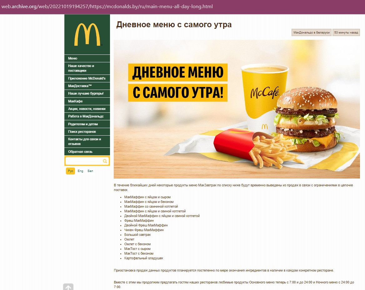 Абноўлена 26.10. Праз некаторы час паведамленне аб зменах у меню знікла з сайта кампаніі. Сняданкі застануцца, але свіныя катлеты заменяць на ялавічныя, сцвярджае «Бел**т» са спасылкай на свае крыніцы. На сайце McDonald’s пазначана, што ялавічна катлеты вырабляюцца ТАА «МаррРуссия», пастаўшчык мяса — «Слонімскі мясакамбінат».