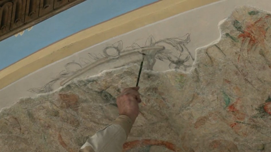 – Спецыялісты “Белрэстаўрацыі” старанна знялі новую і старую тынкоўку, расчысцілі яе, умацавалі і ўсталявалі на месца, – расказаў дырэктар Гродзенскага гісторыка-археалагічнага музею Юрый Кітурка.