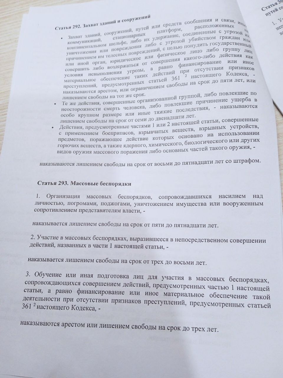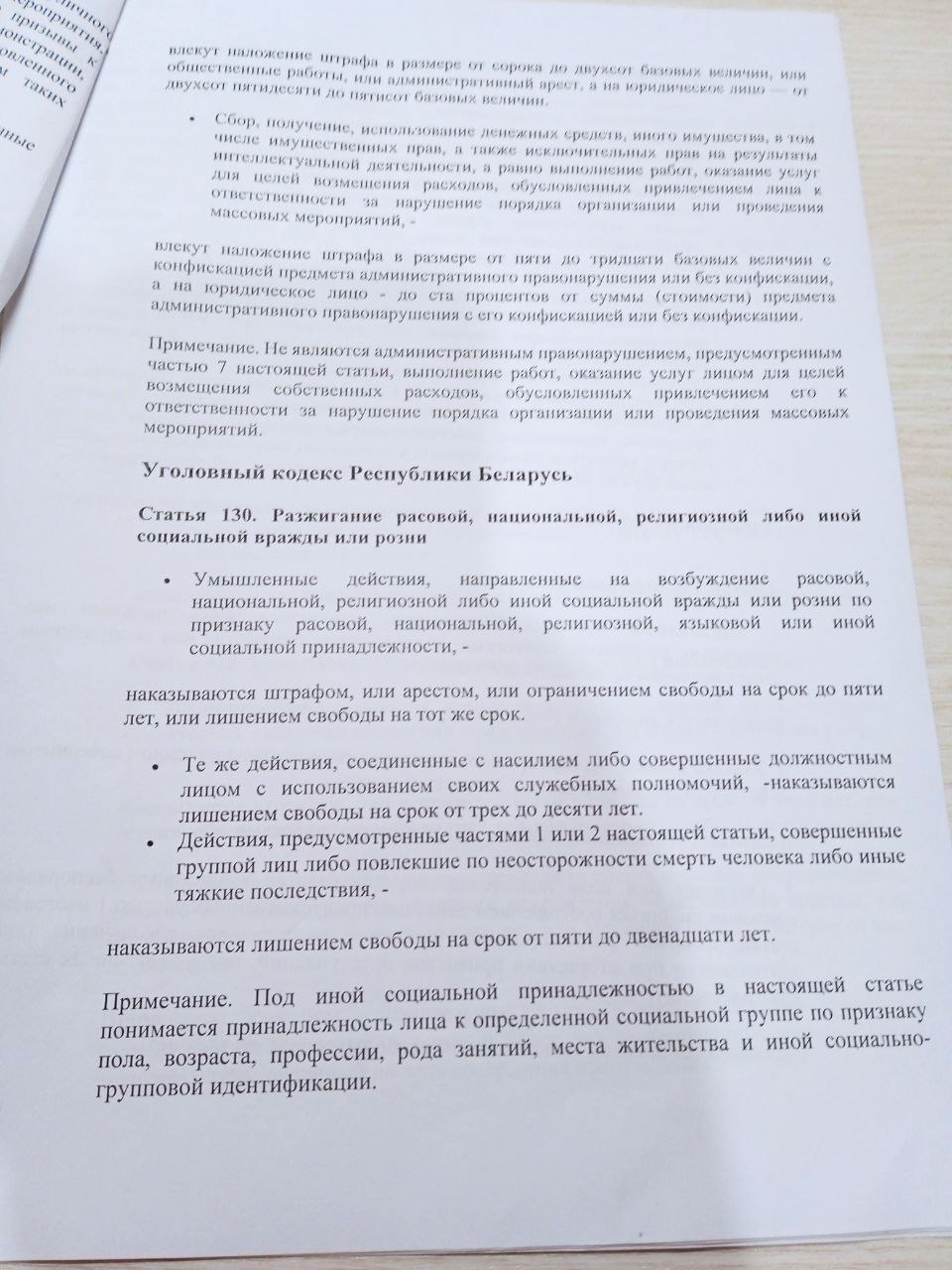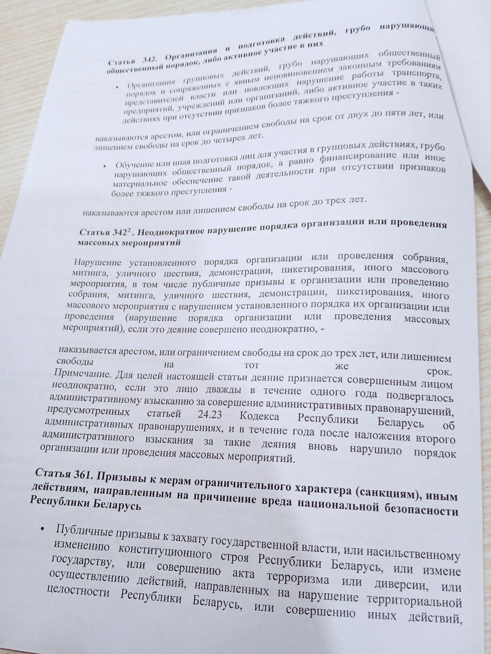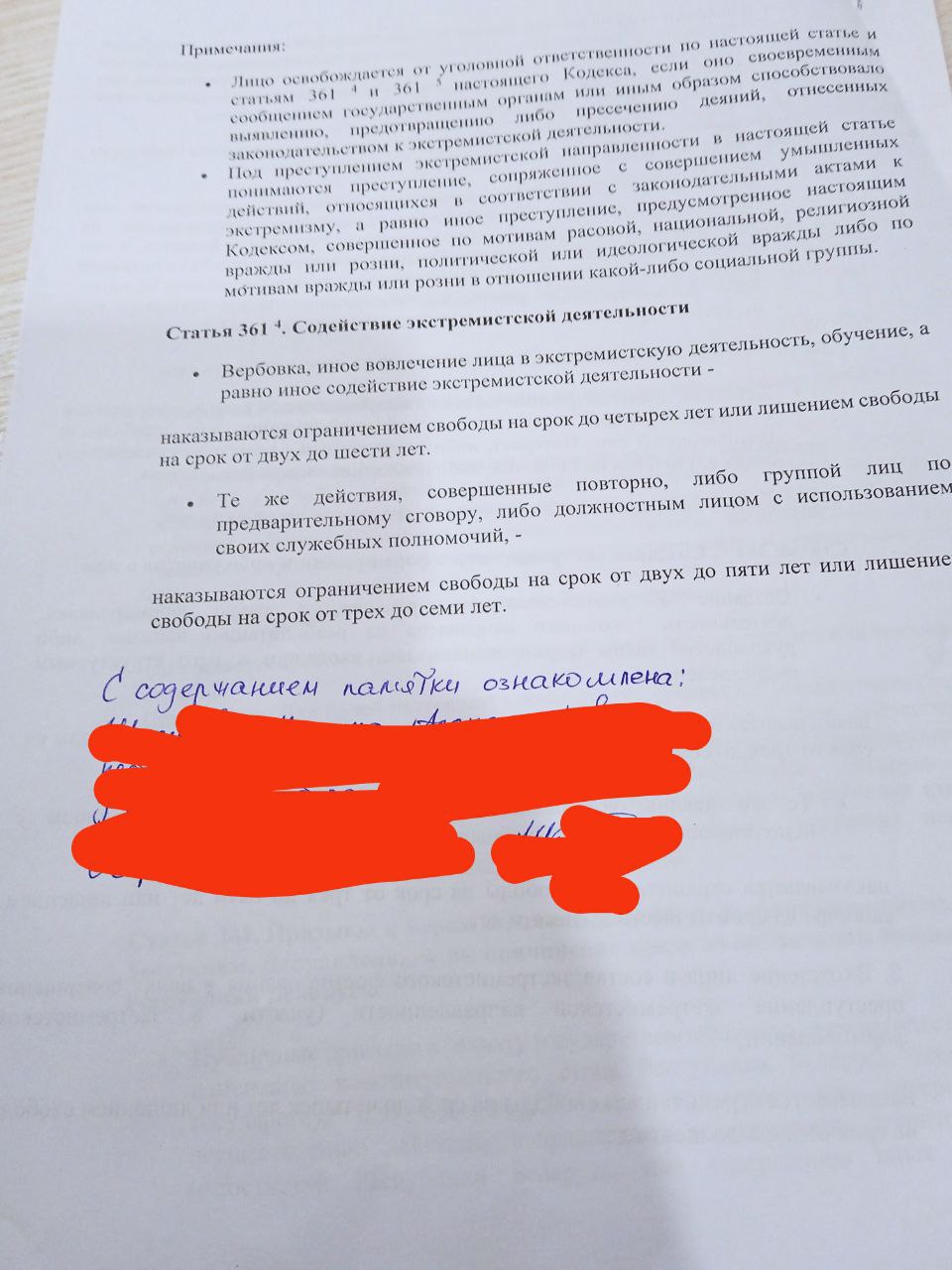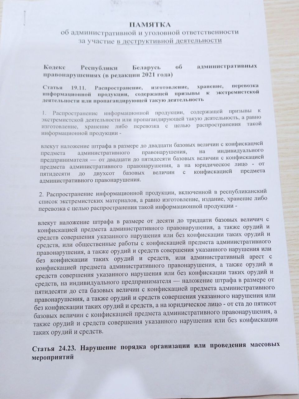 Акрамя гэтага, Абрамчык выклаў памятку. У ёй прапісана адказнасць па арт. 19.11 КаАП, ст. 24.23 КаАП, ст. 130 КК, ст. 292 КК, ст. 293 КК, арт. 342 КК, ст. 361 КК, ст. 361−4 КК. Унізе была прыпіска “з памяткай азнаёмленая” — і подпісы настаўнікаў.