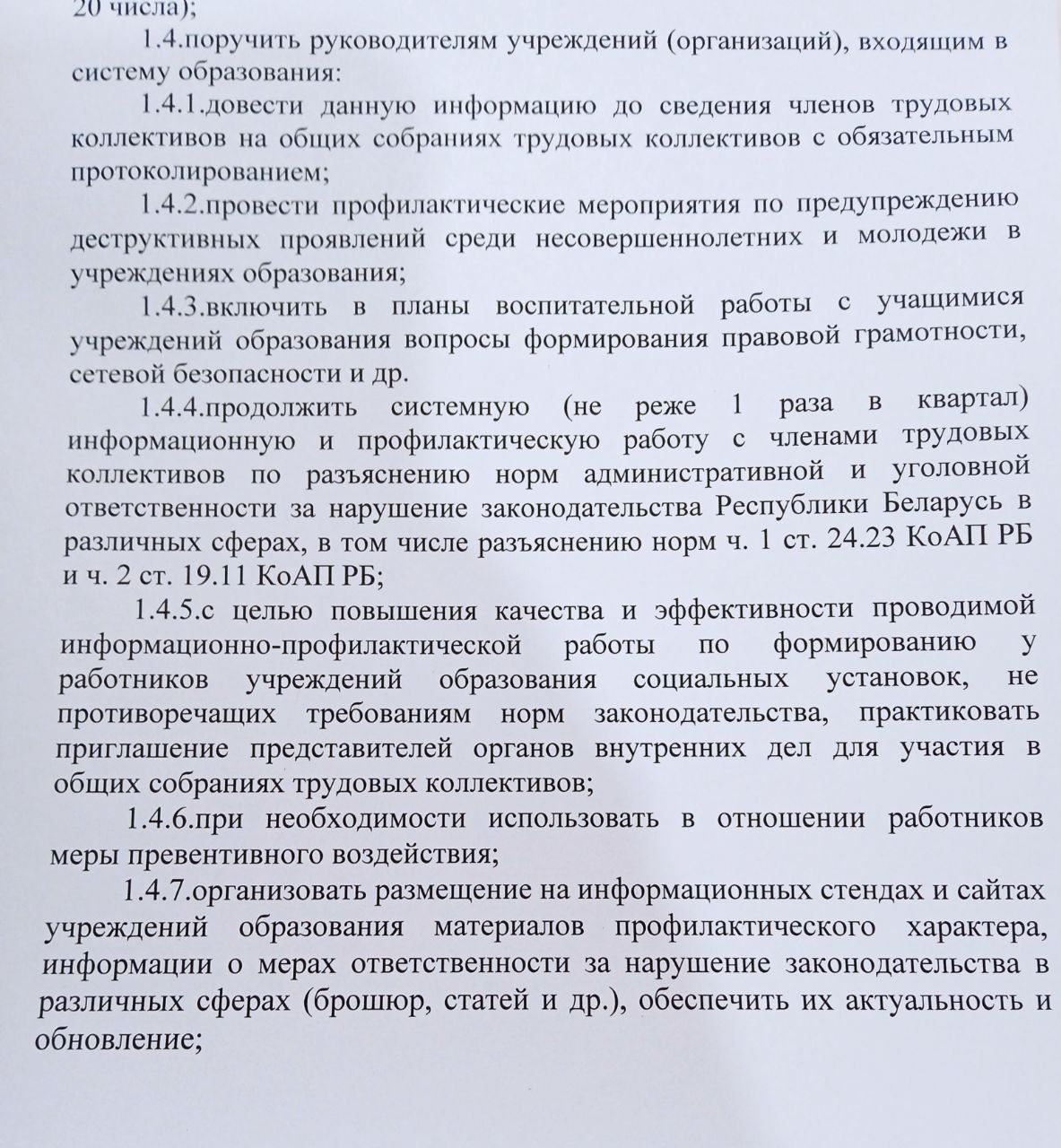 “Не ў школе N18, а па ўсёй вобласці, не звальняюць, а прафілактуюць, і не КДБ, а наймальнікі. Каб не стаялі потым нашы калегі ля знакамітых дзвярэй, бо тады сапраўды прыйдзецца звальняць за ўчыненне правапарушэння, з педагагічнай дзейнасцю несумяшчальнага. <…> Адным з падстаў скасавання працоўнага дагавора па ініцыятыве наймальніка з’яўляецца здзяйсненне працаўніком, які выконвае выхаваўчыя функцыі, амаральнай правіны, несумяшчальнага з працягам дадзенай працы».
