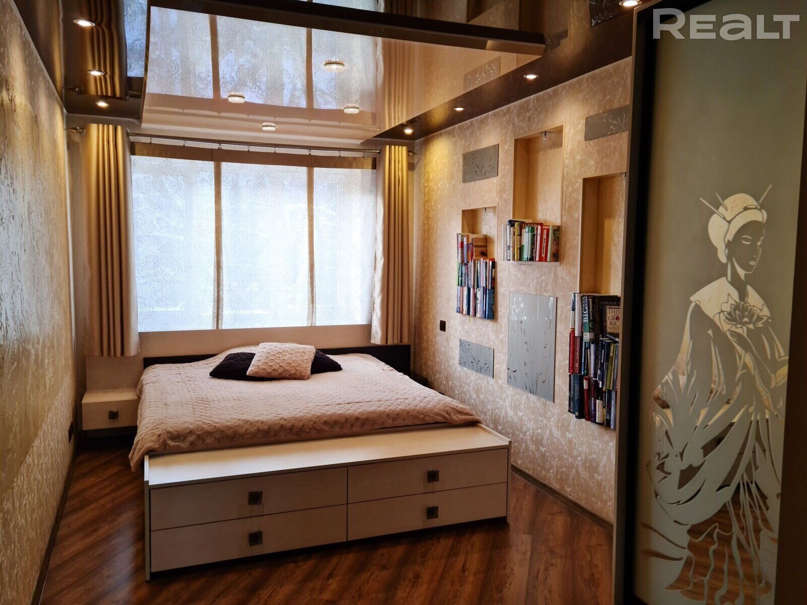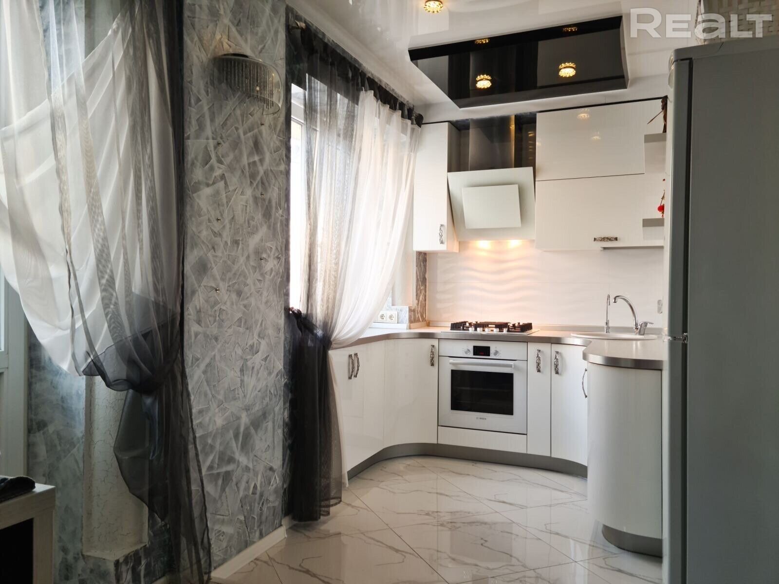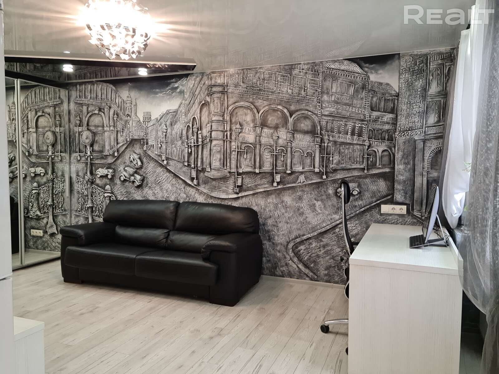 Кватэра размешчана на трэцім паверсе пяціпавярховага дома. З мэблі – убудаваная кухня, спальны гарнітур, два камандора, стол, імпартная сантэхніка. На сценах – шпалеры і мастацкая дэкаратыўная тынкоўка (ляпное пано). Плошча кватэры – 46.6 м2.
