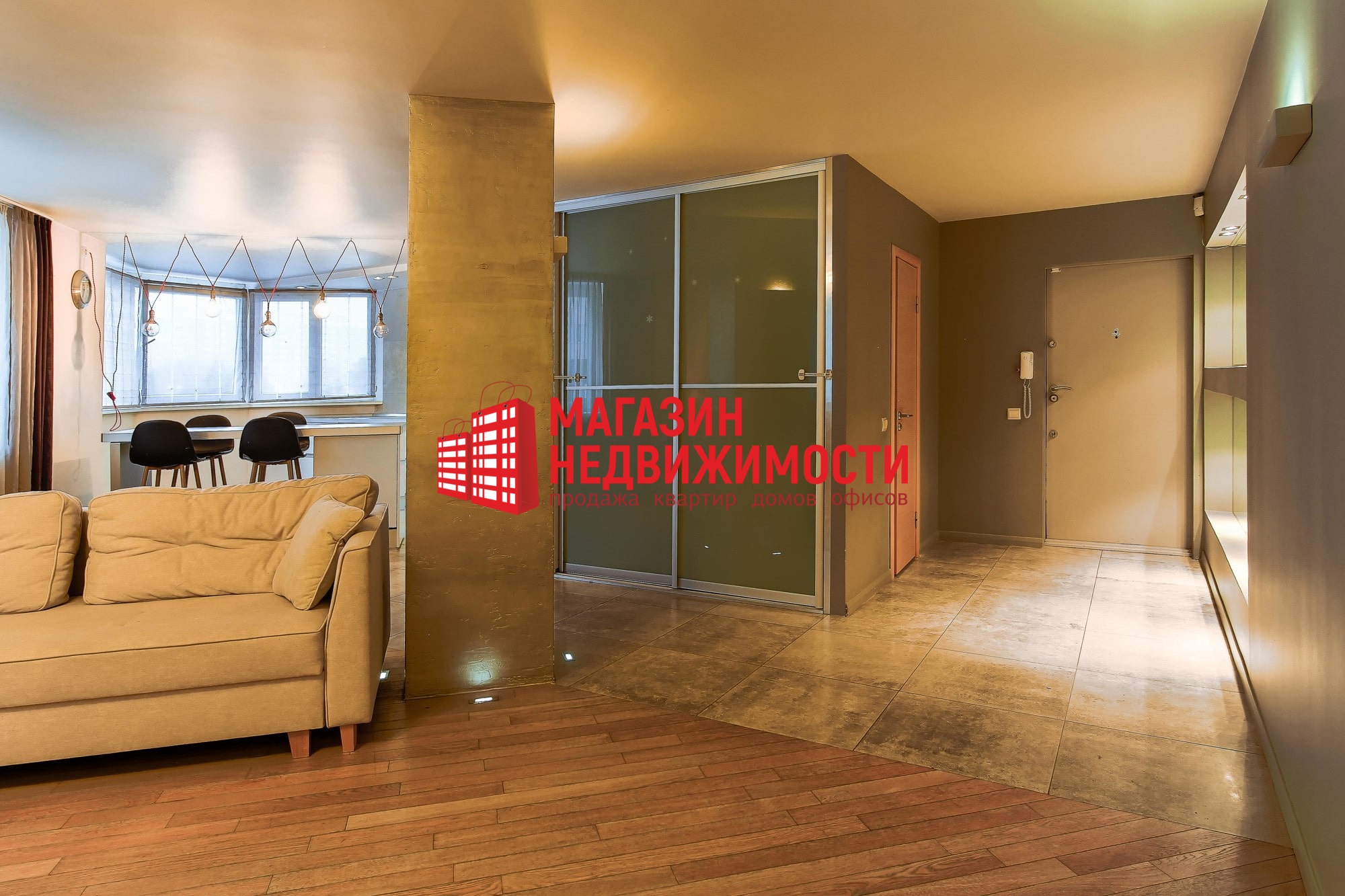 Кухня сумешчана з гасцінай. Убудаваная бытавая тэхніка фірмы BOSCH. Ва ўсёй кватэры двухузроўневая столь, міжпакаёвыя дзверы з натуральнага дуба, шклопакеты. Ёсць лоджыя і балкон. Санвузел паасобны.