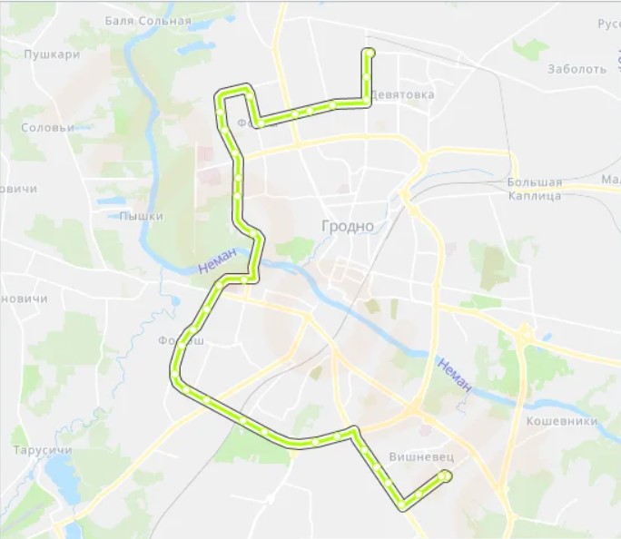 Вішнявец – Вішнявец-5 – Вішнявец-7 – Малахавічы – вуліца Вішнявецкая – Пошта – Крама “Нарач”- Вуліца Славінскага – Хімвалакно – Вуліца Выдавецкая – Вуліца Акульная – ГАП № 1 – Гроднажылбуд – Вуліца Хвойная – Вуліца Вольгі Соламавай – Сярэдняя школа № 37 – “Алмі” – “Фламінга” – “Еўраопт” – Крама “1000 дробязяў”- Белаграпрамбанк – Каледж эканомікі і кіравання – Вуліца Вясновая – Вуліца Фестывальная – Вуліца Болдзіна – Крама “Купалінка” – Гімназія № 5 – Вуліца Дамброўскага – Вуліца Урублеўскага – Каледж тэхнікі, тэхналогій і дызайну – Радыёхваля – Вытворчасць аўтаагрэгатаў- Вуліца Гаспадарчая – Гроднааблнафтапрадукт – Дзевятоўка- Вуліца Белыя Росы.