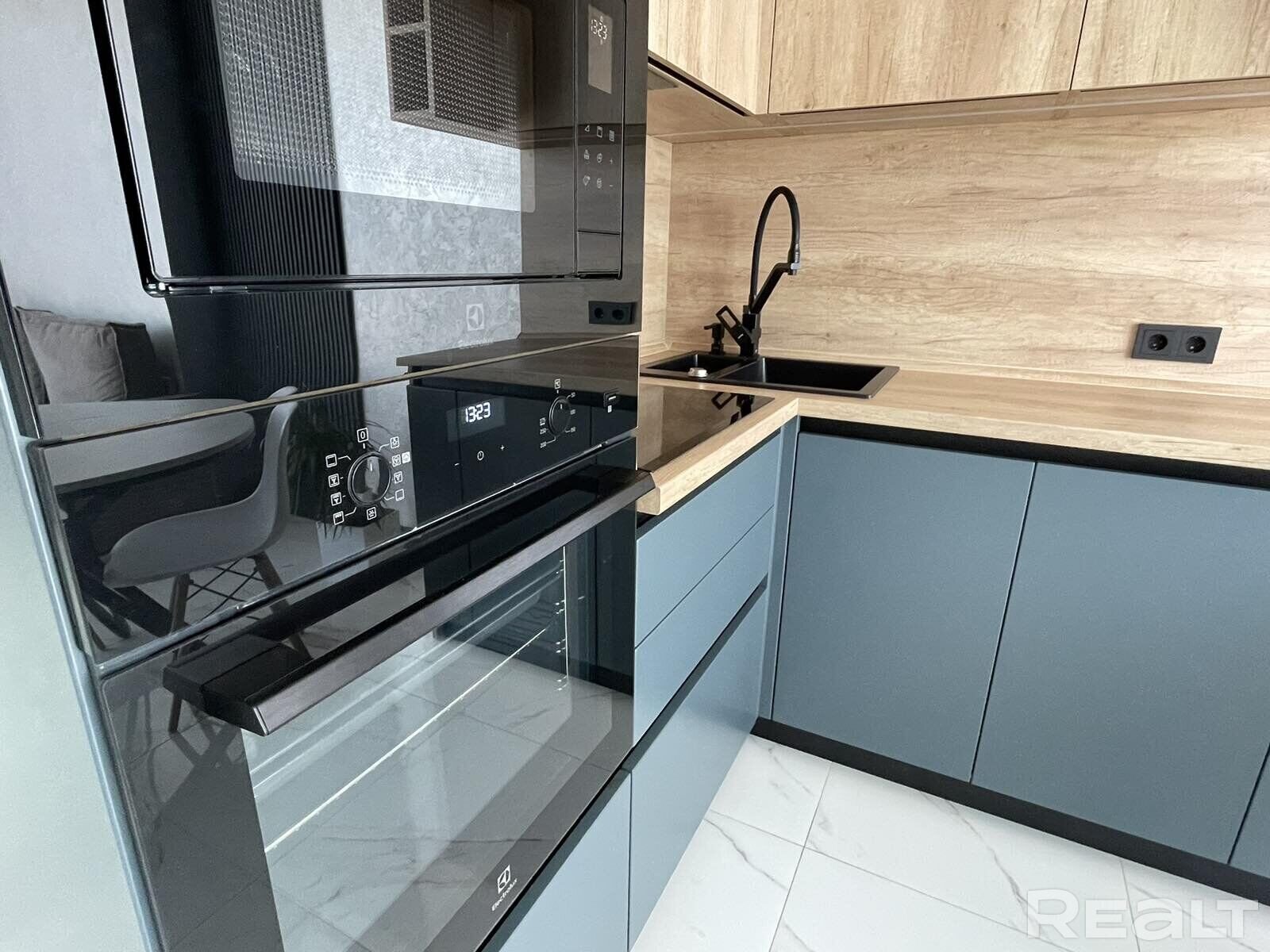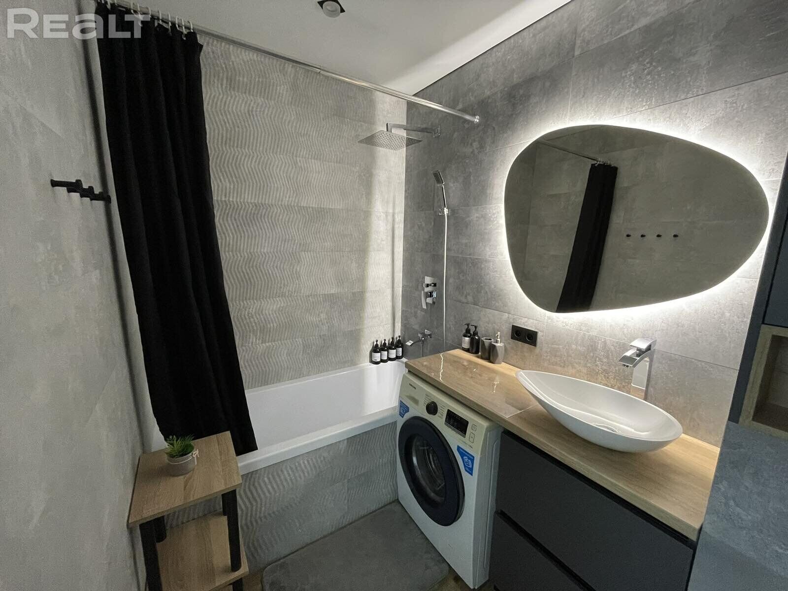 Санвузел сумешчаны. У кватэры – цёплыя падлогі. Падлога ў спальні – ламінат, у калідоры, кухні — плітка. Кухня выканана па індывідуальнай замове. Там ёсць падсвятленне, скіналі (суцэльны ліст шкла, спецыяльны фартух для абароны працоўнай зоны), індукцыйная варачная панэль, убудаваная посудомойка, убудаваны халадзільнік, духавая шафа. Ёсць асобнае кропкавае асвятленне. Уся бытавая тэхніка – імпартная. У калідоры за схаванай дзвярыма абсталявана гардэробная.