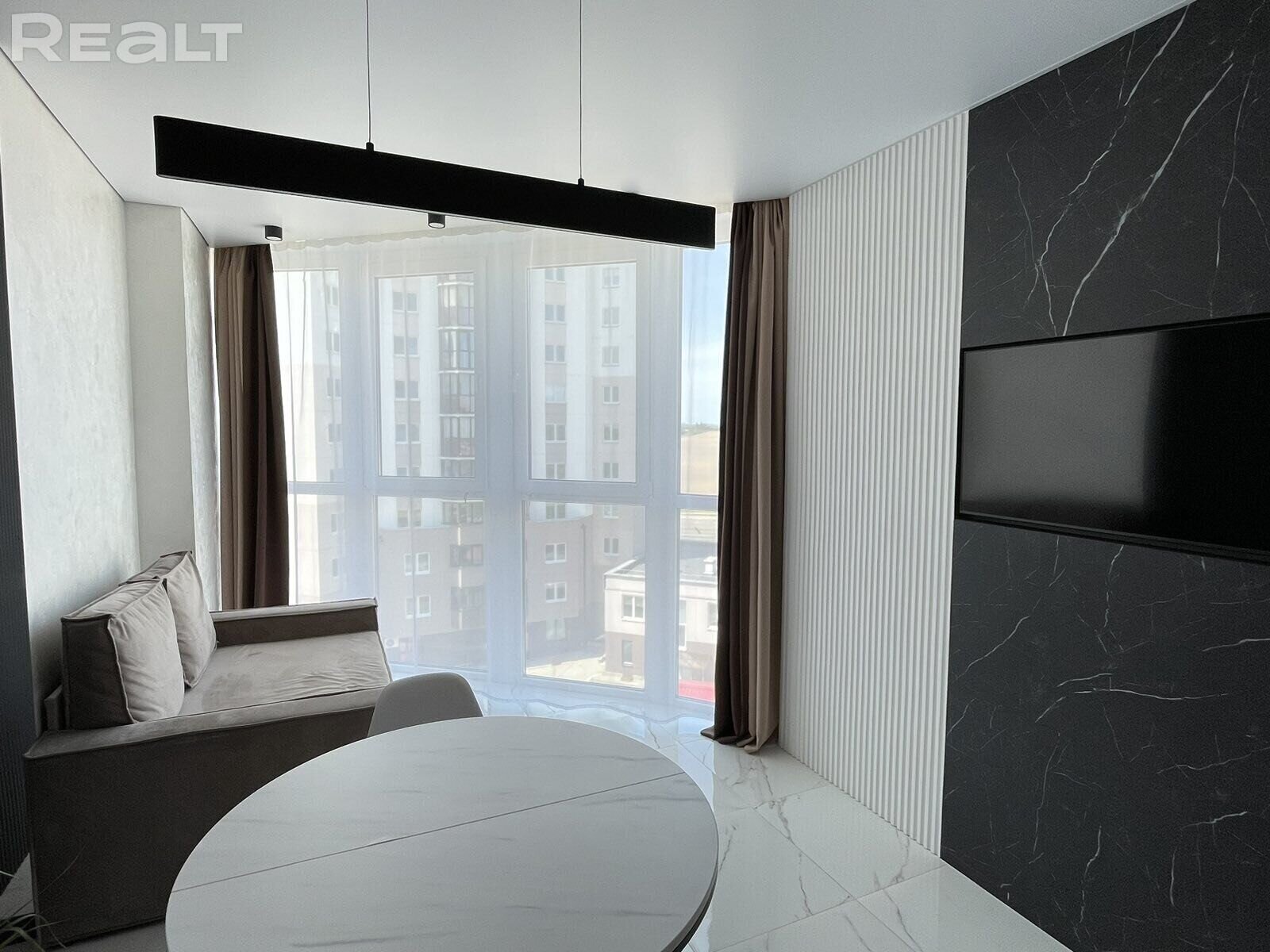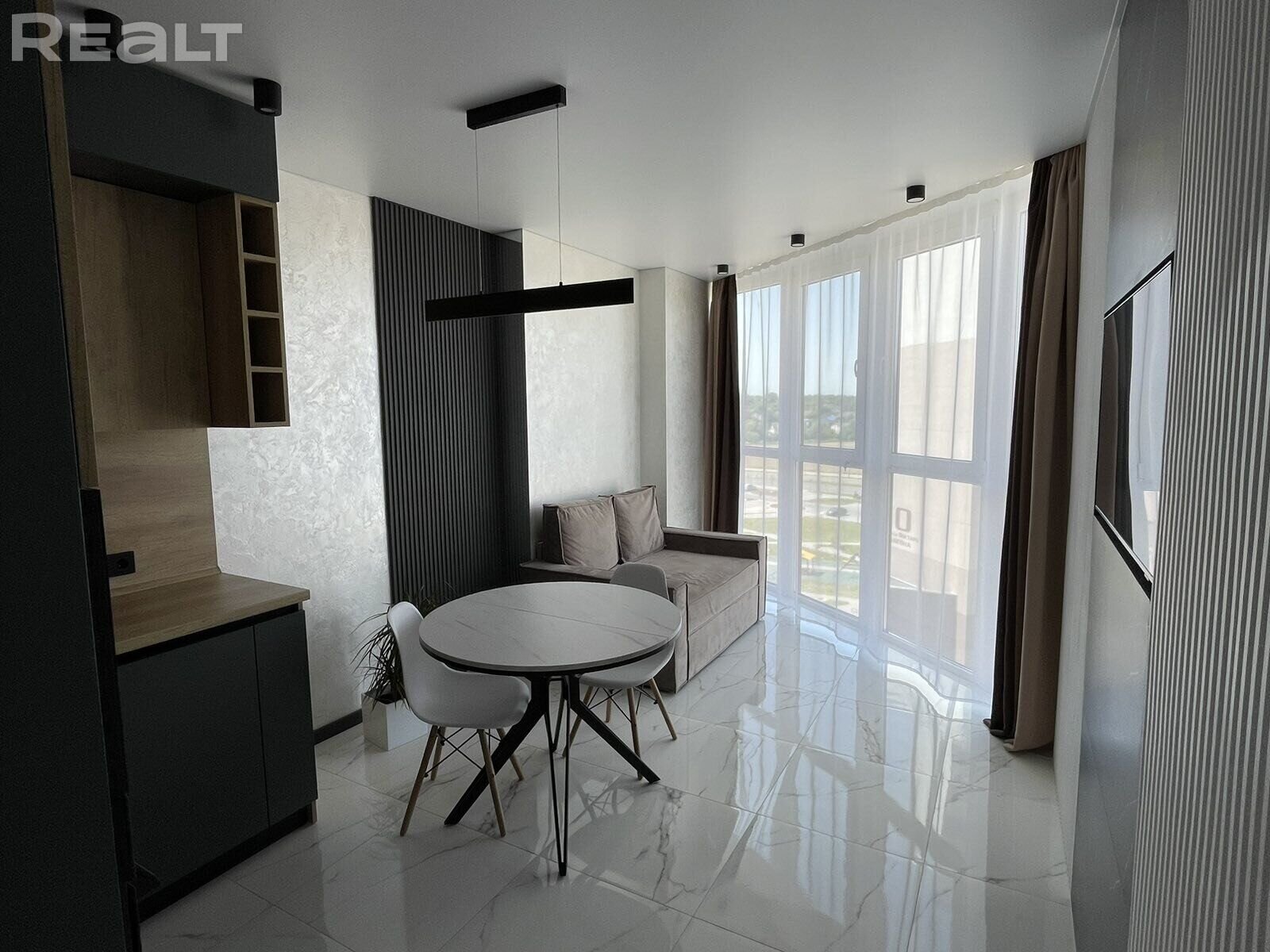 Пакой з кухонным кутком атрымаўся пасля злучэння кухні і лоджыі. Так атрымалася павялічыць яе плошчу і зрабіць панарамнае акно. Праўда, выгляд з яго не самы захапляльны — на суседнюю шматпавярхоўку і поле.