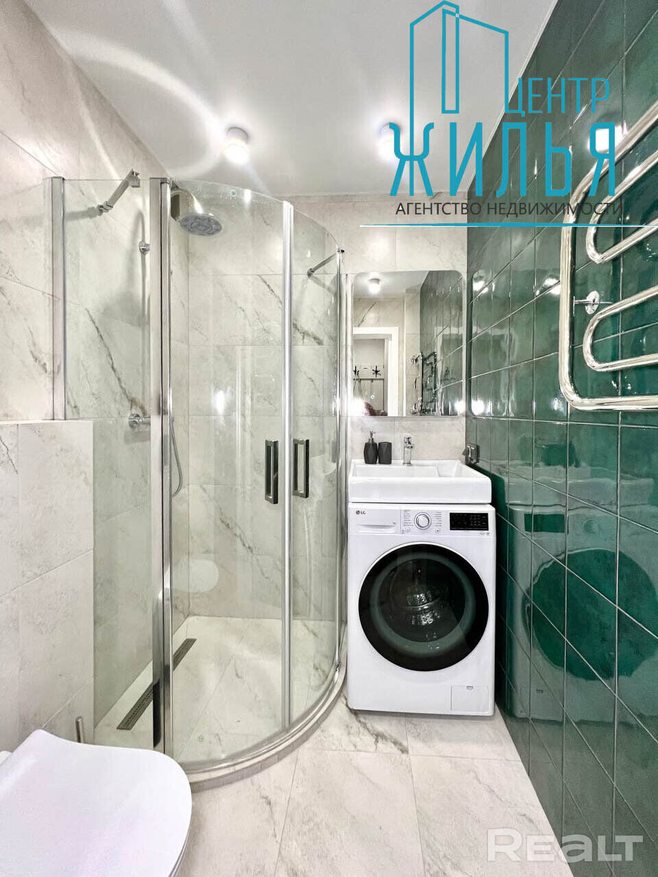Сумешчаны санвузел абліцаваны пліткай, усталявана прасторная душавая кабіна, пральная машына LG.