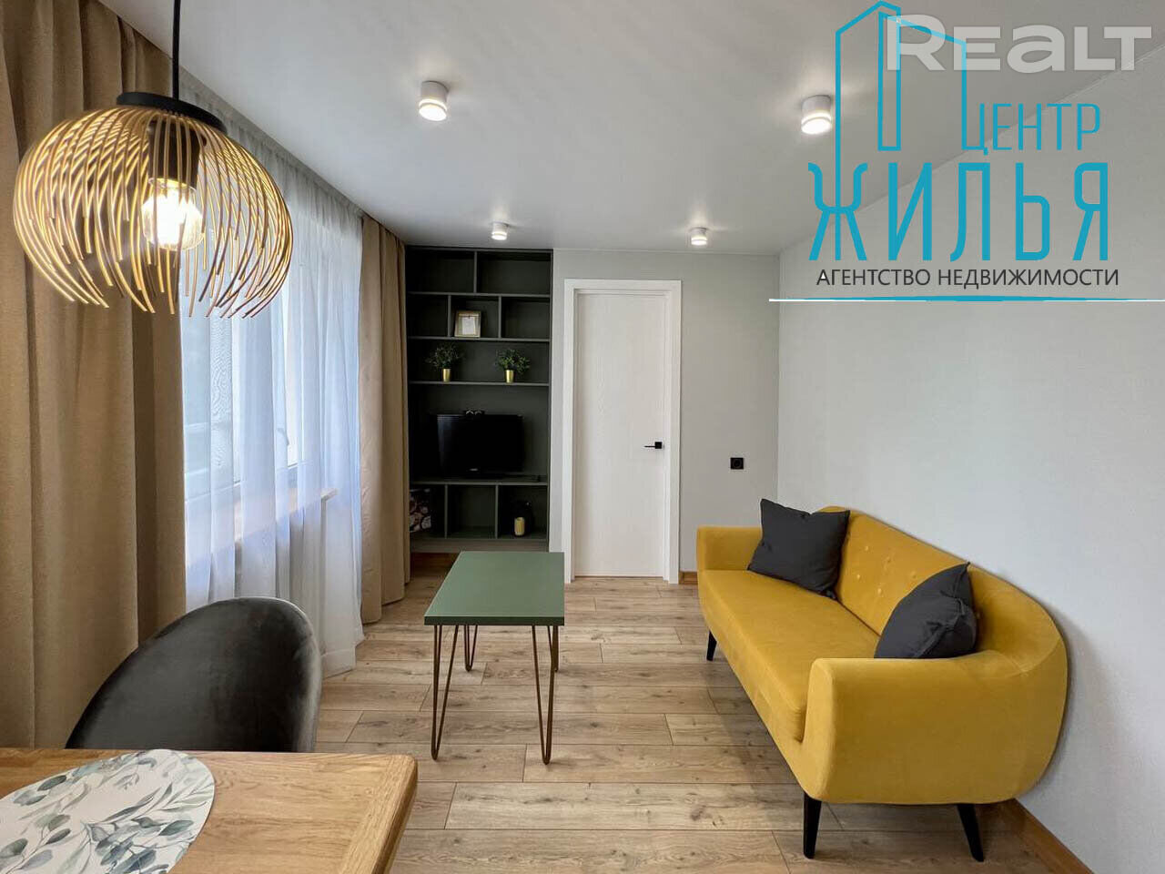 Кватэра кампактная – усяго 44 кв.м. Першапачаткова яна была трохпакаёвай, але ўладальнікі правялі ўзаконеную перапланіроўку. Цяпер у кватэры два пакоі, а кухня аб’яднана з гасцёўняй. Падчас рамонту залілі сцяжку, замянілі ўсю электрыку і сантэхніку, усталявалі новыя лічыльнікі і газавую калонку з сігналізатарам бяспекі.