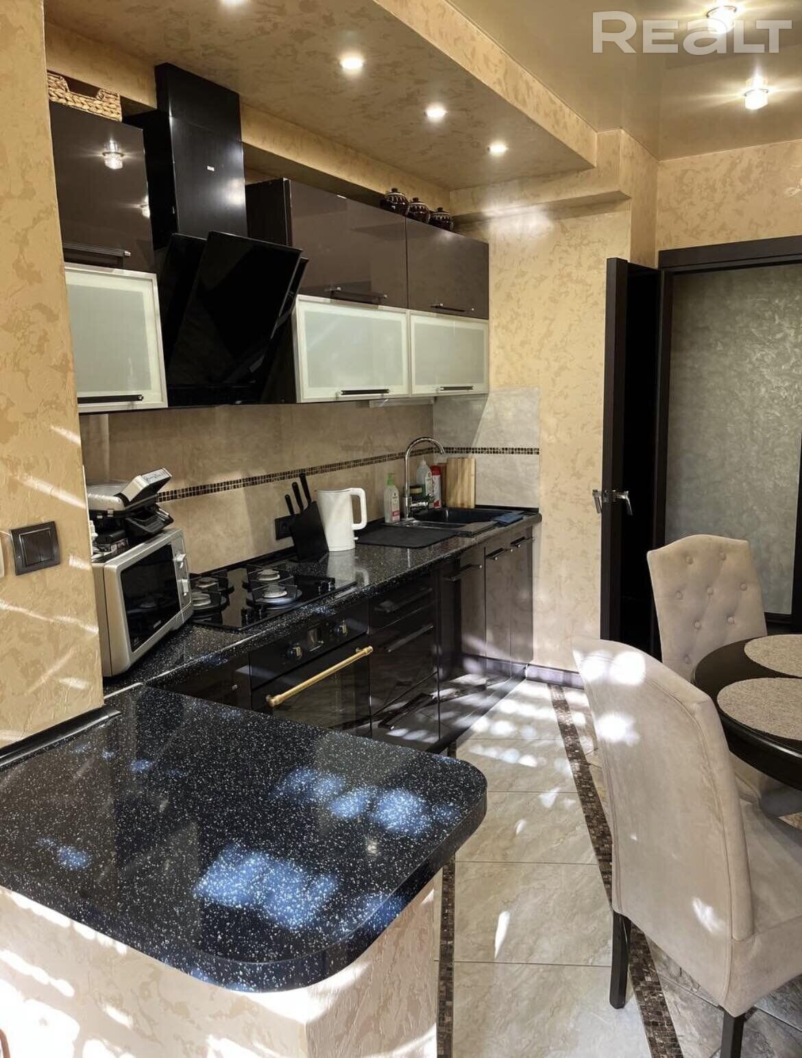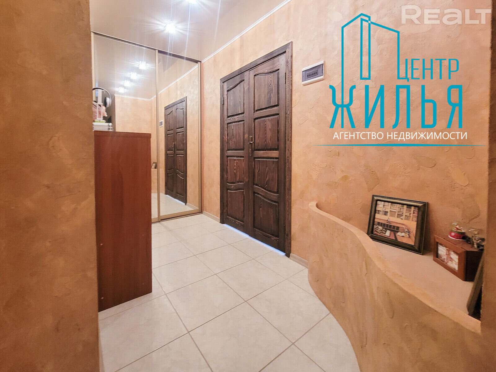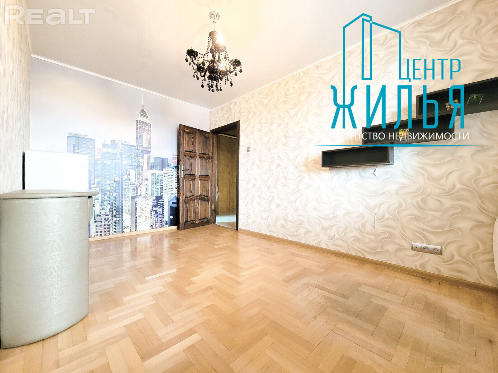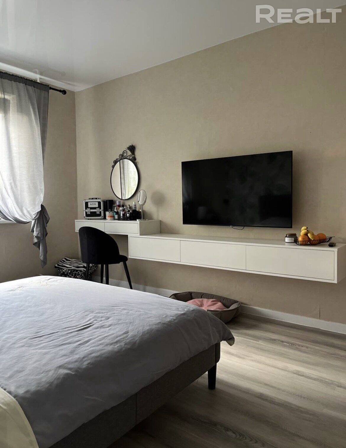 На падлозе – паркет. Усе падлогі выведзеныя на адзін узровень. Кухня абсталявана ўбудаванай мэбляй і тэхнікай: індукцыйная варачная панэль, электрычная духавая шафа, выцяжка. У кватэры – дзве лоджыі. У гасцінай, кухні і адным з пакояў ёсць тэлевізары.