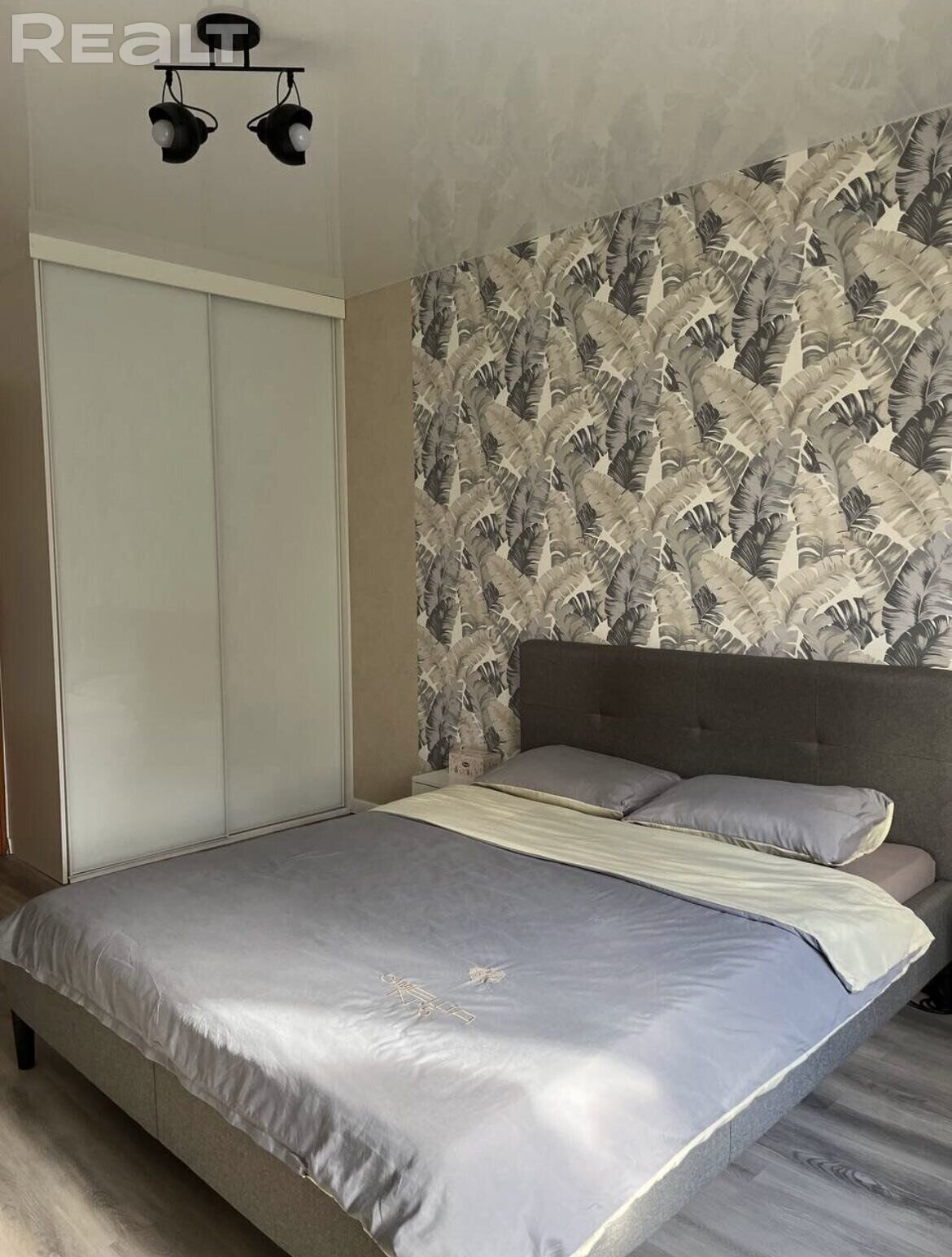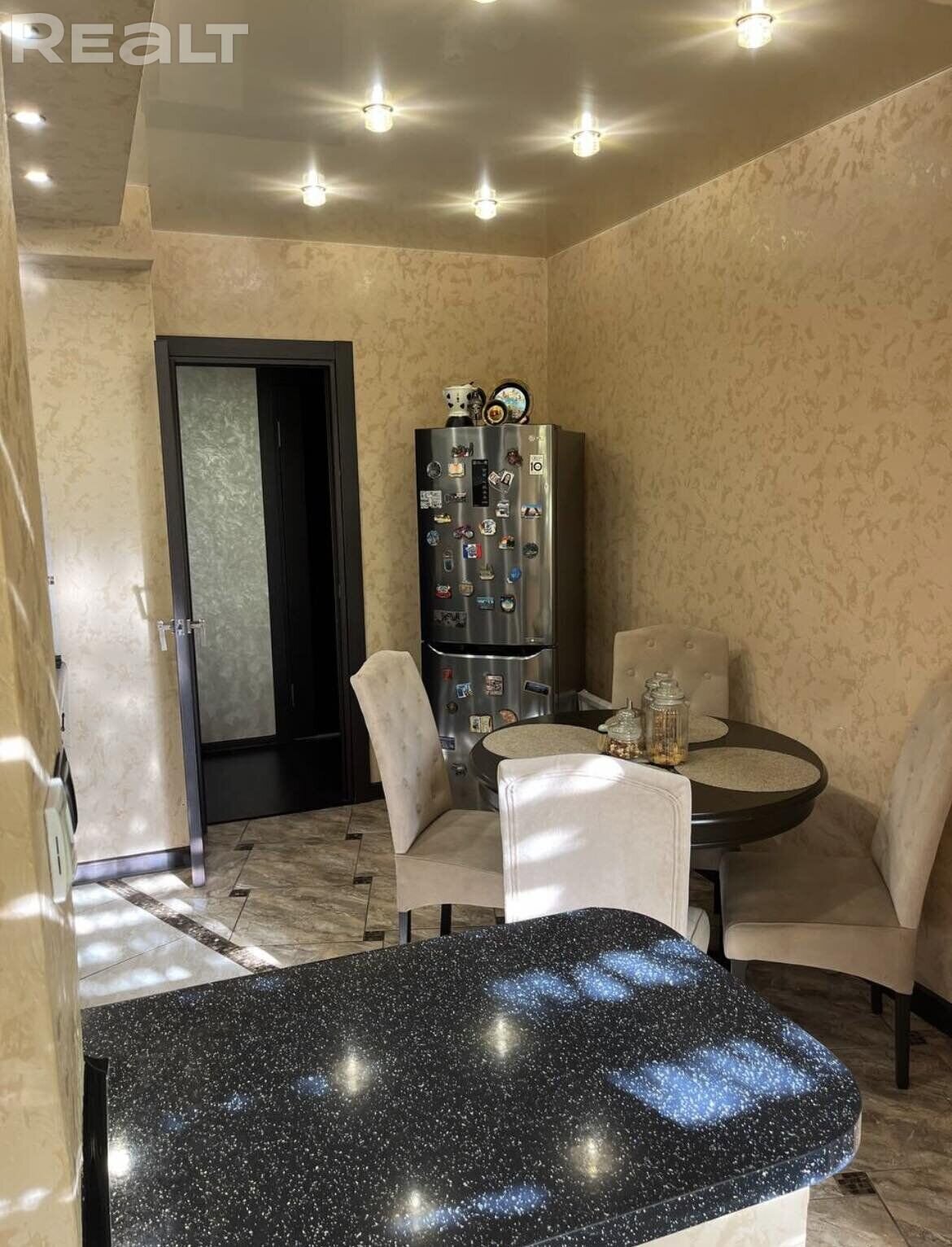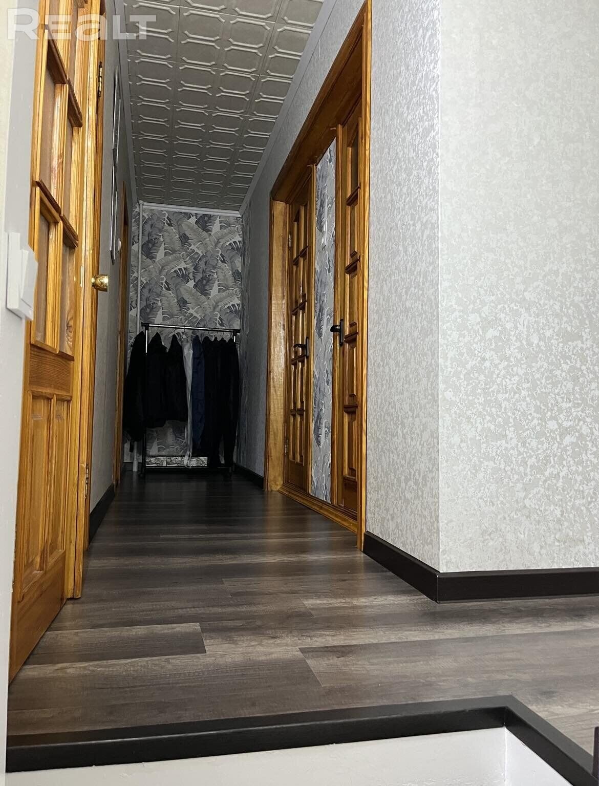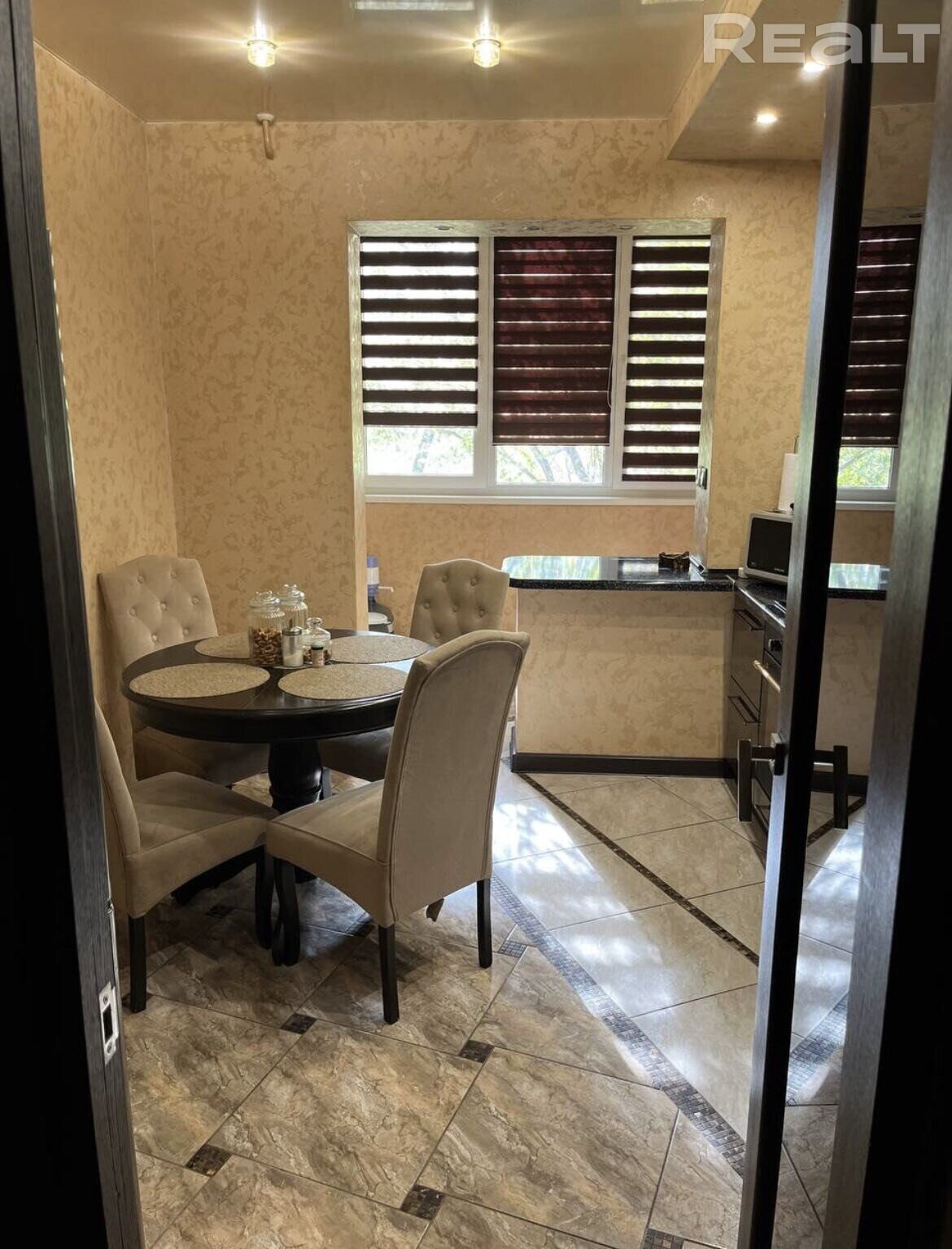 На падлозе – паркет. Усе падлогі выведзеныя на адзін узровень. Кухня абсталявана ўбудаванай мэбляй і тэхнікай: індукцыйная варачная панэль, электрычная духавая шафа, выцяжка. У кватэры – дзве лоджыі. У гасцінай, кухні і адным з пакояў ёсць тэлевізары.