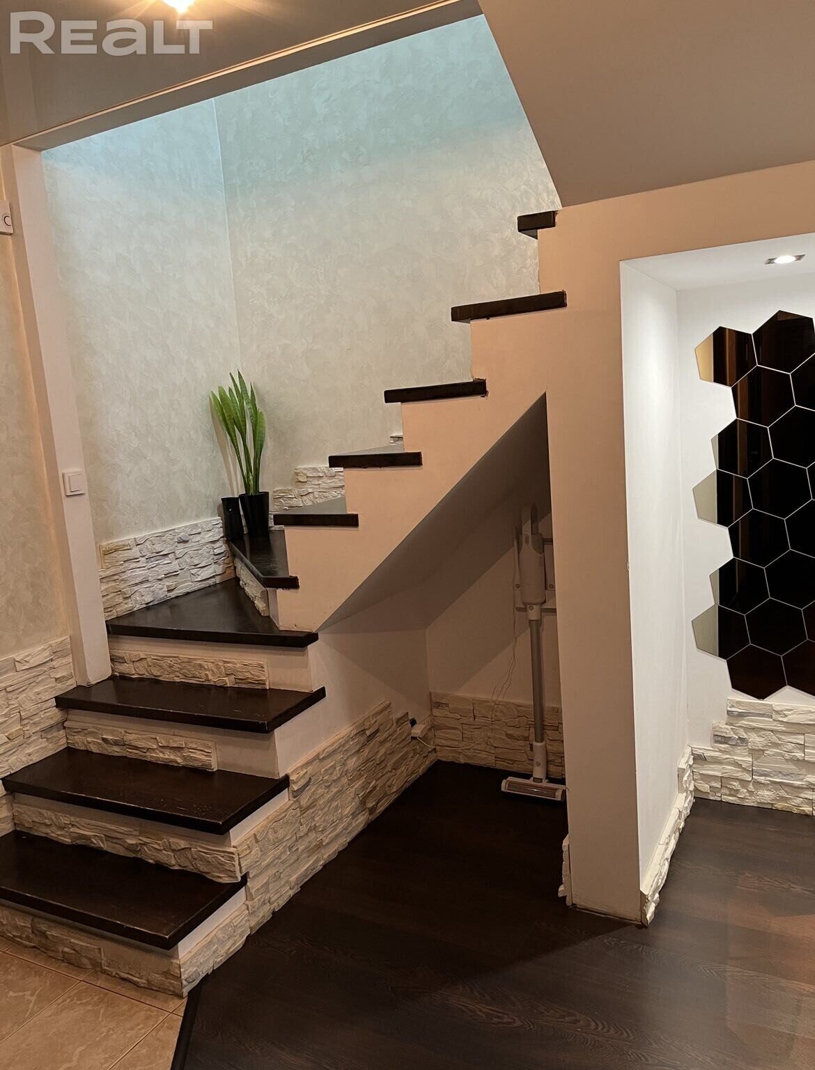 На першым узроўні ёсць гасцёўня, кухня і жылы пакой. На другім – тры спальні. У кватэры два санвузлы з вялікай кутняй ваннай і душавой кабінай.
