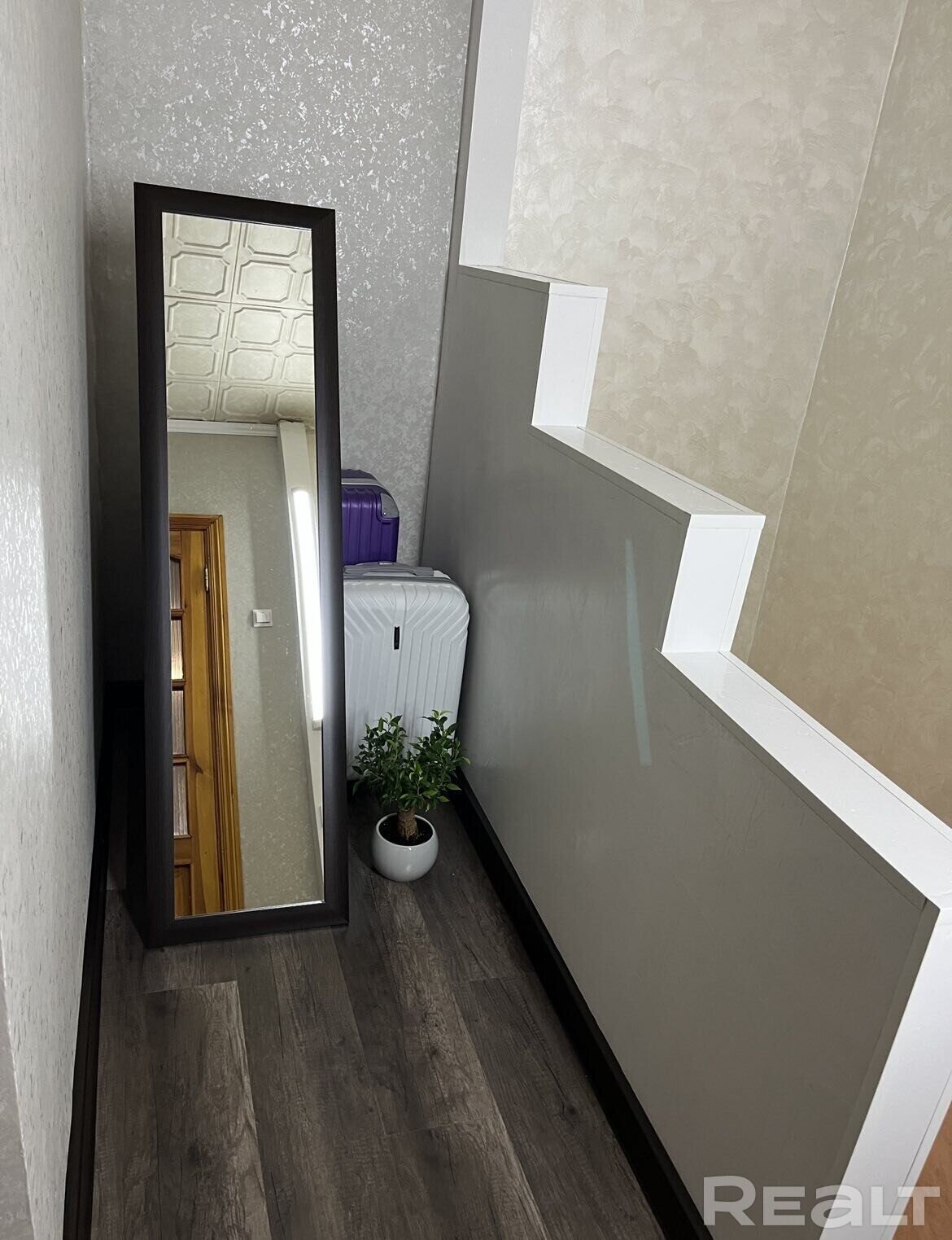 У кватэры частковы рамонт. На першым паверсе ў жылых пакоях на падлозе плітка, ламінат. Сцены выраўнаваны, абклееныя шпалерамі. Столі нацяжныя. На другім паверсе просты рамонт. У інтэр’еры пераважна выкарыстоўвалі чорныя, шэрыя і жоўтыя колеры. У гасціную з тэлевізарам вядзе арка.