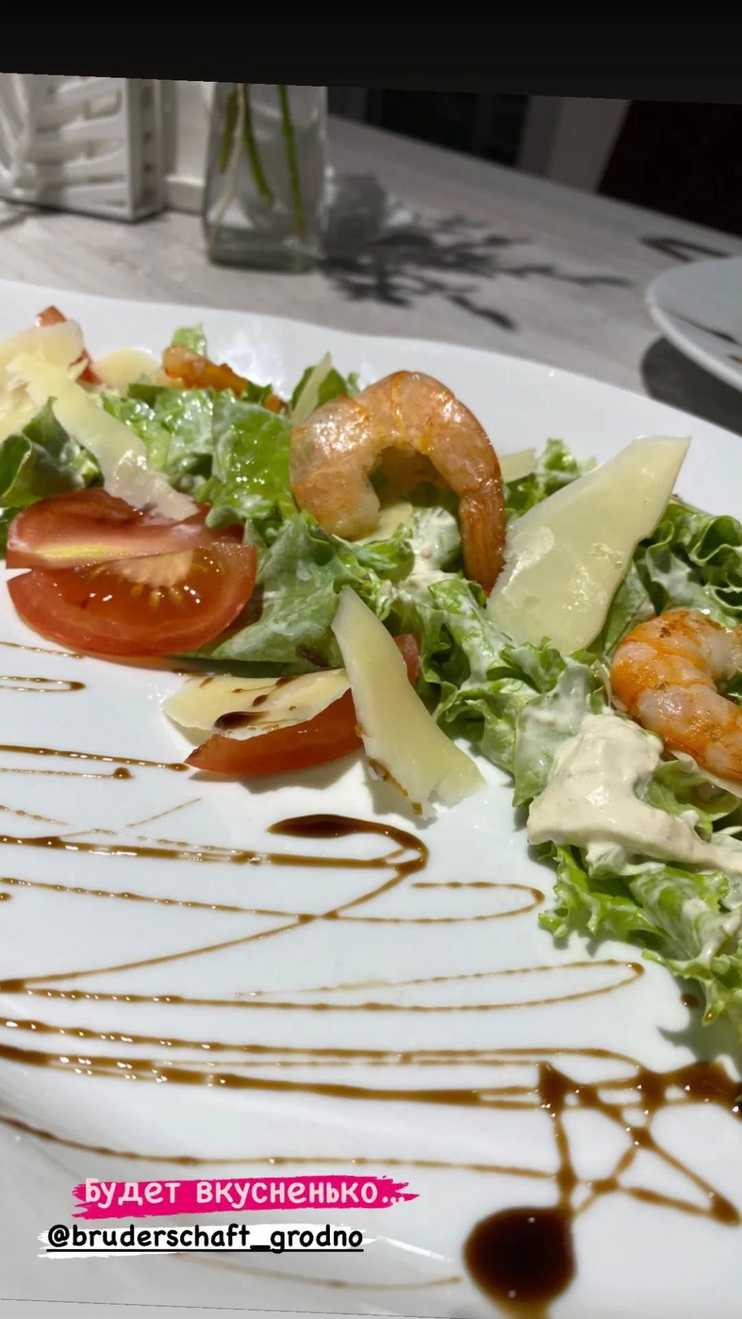 З фірмовых страваў – шніцаль «Брудэршафт» з яйкам, бульбянымі дзелькамі і квашанай капустай, усё разам – на паўкіло, і салат “Брудэршафт”. Таксама на гарачае прапануюць курынае сцягно ў мядовым соусе з бульбай, стейк рыбай ці чырвоную рыбу з гароднінай, кебаб. Асобных прапаноў для вегетарыянцаў няма.