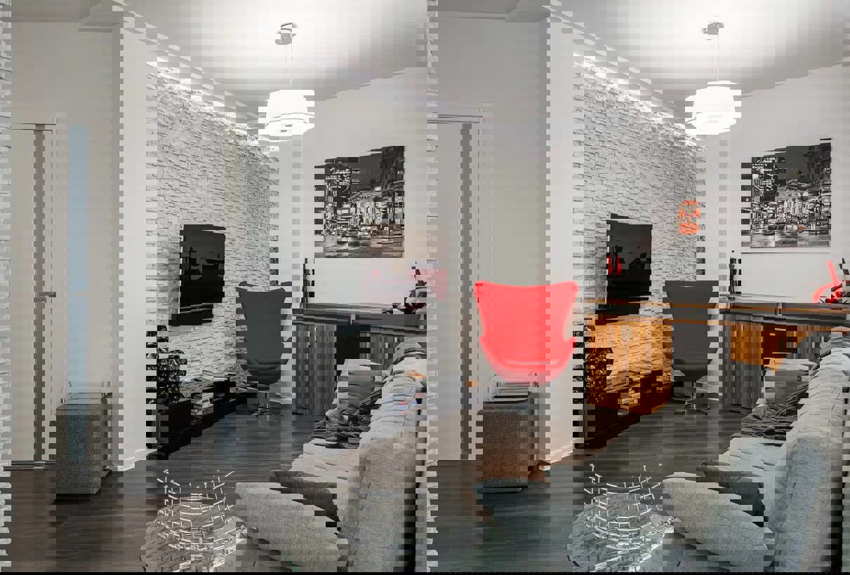 Кухня сумешчана з гасцінай. У гасцінай размешчаны шэрая канапа, два камоды, тэлевізар і яркае чырвонае крэсла. Колеры акцэнтаў у дэкоры пераклікаюцца. Сцяна зрабіла з імітацыяй цэглы. У спальні – двухспальны ложак, тумбачкі, тэлевізар. Для захоўвання рэчаў у спальні і пярэднім пакоі ёсць па шафе-камандору. Кухня выканана ў светлых танах. Крэслы – у далікатна-бірузовых адценнях.