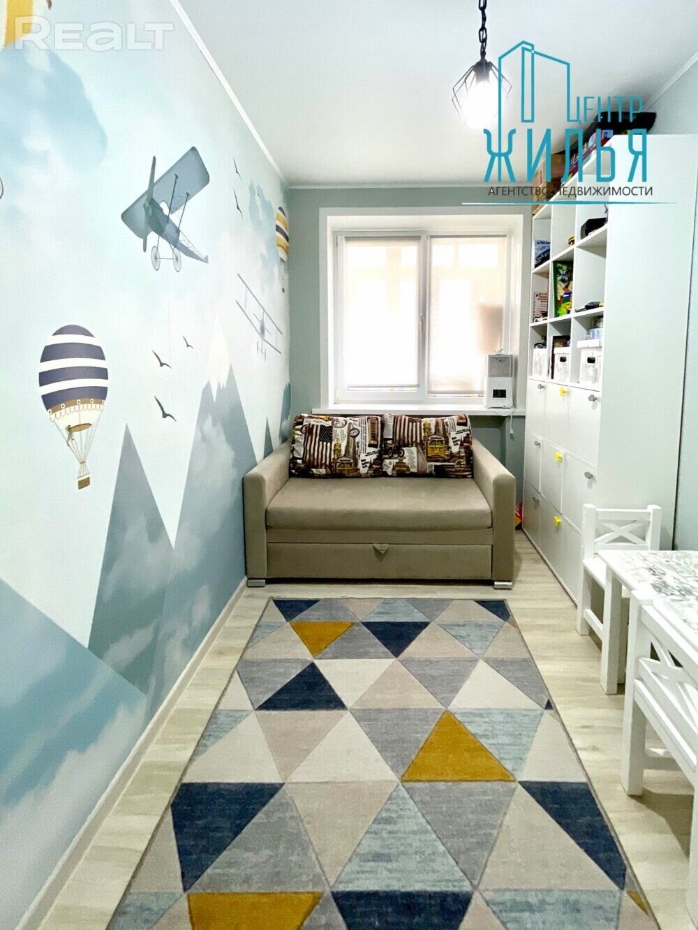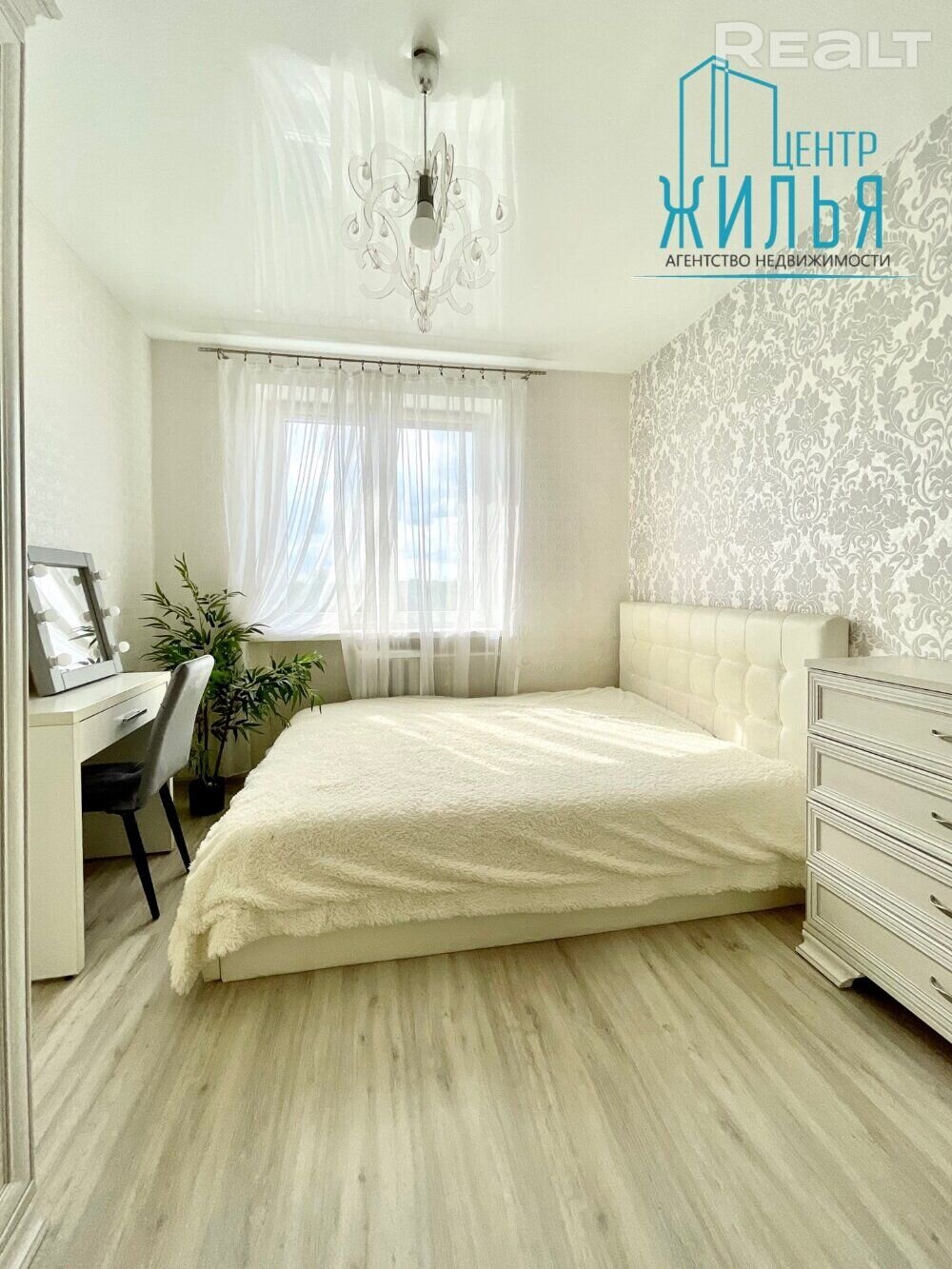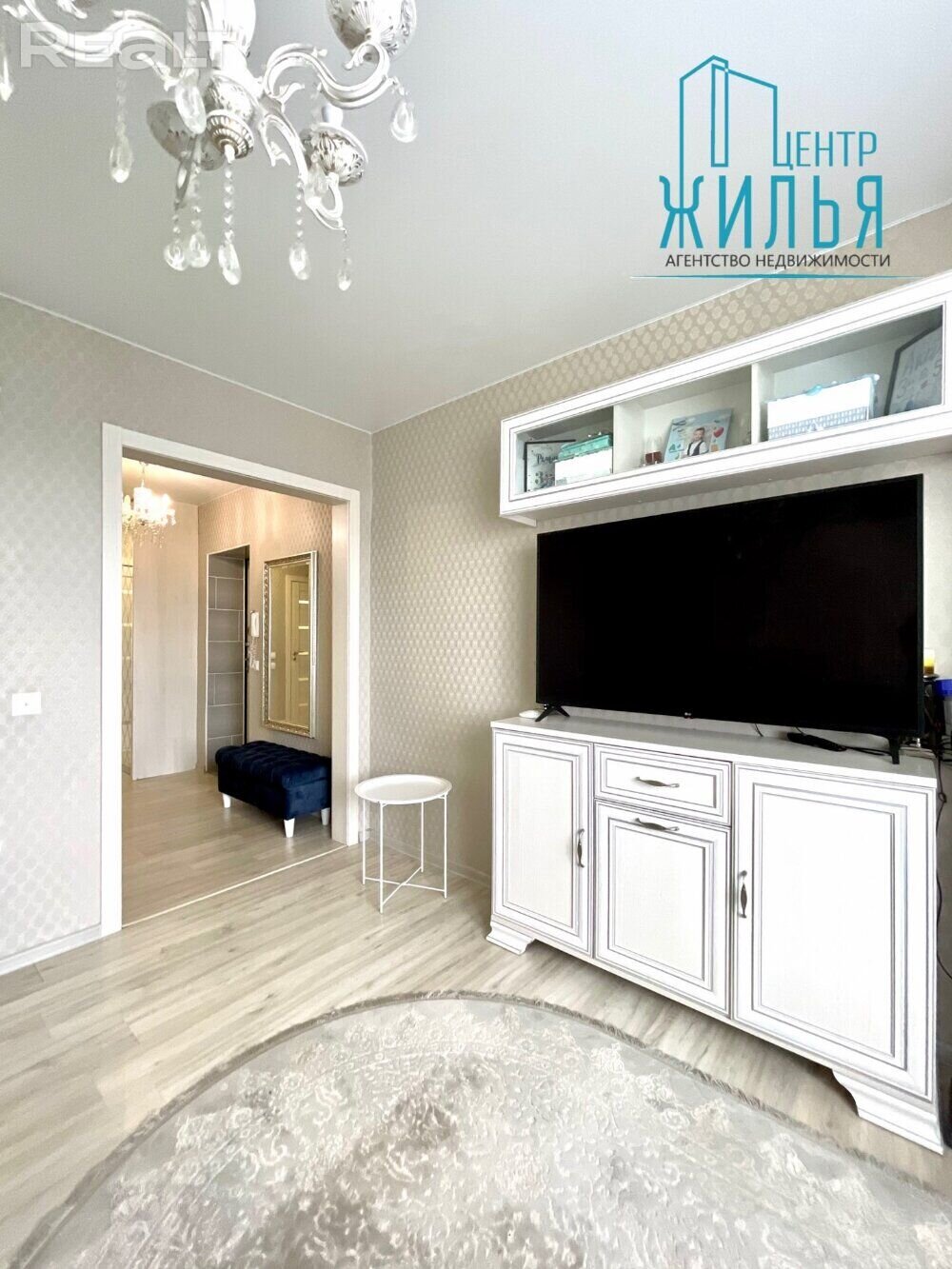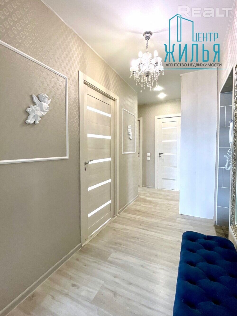Стыль у кватэры хутчэй класічны – гэта можна ўбачыць па люстры, свяцільнях і постацях анёлаў на сценах. У зале пераважаюць светлыя і шэрыя колеры. У кухні – мэбля кантраснага колеру і цёмныя шторы. У спальні – мэбля ў тым жа стылі, ложак і працоўнае месца.