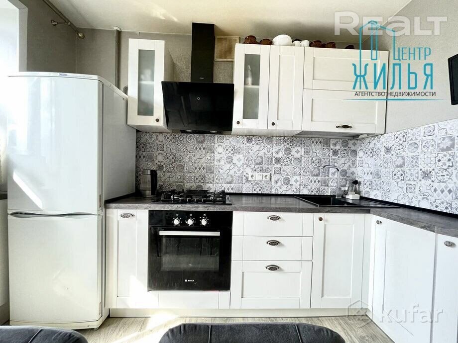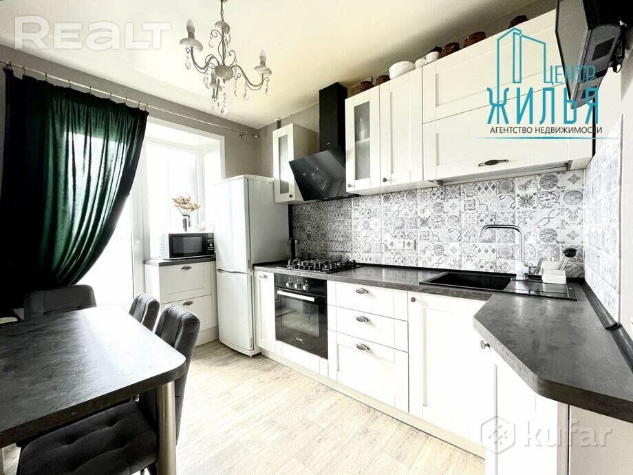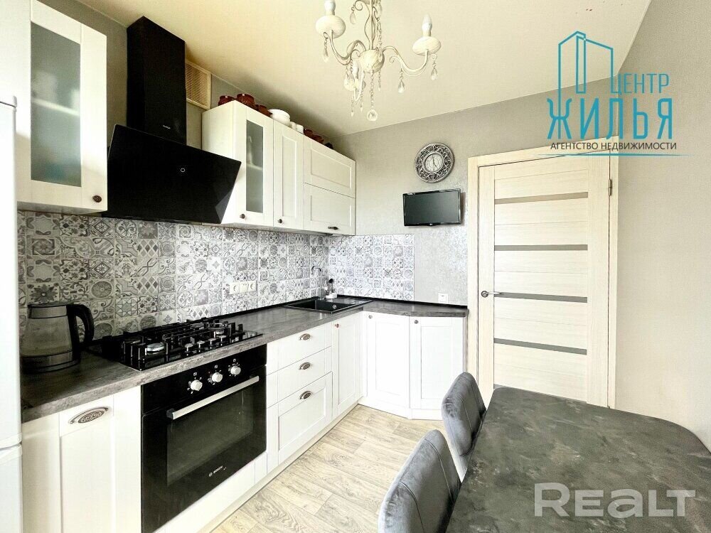 На кухні – убудаваная тэхніка Bosh: газавая варачная панэль, духавая шафа, выцяжка. Для захоўвання рэчаў ёсць шафа-купэ ў пярэднім пакоі. Астатняя мэбля – па дамоўленасці.