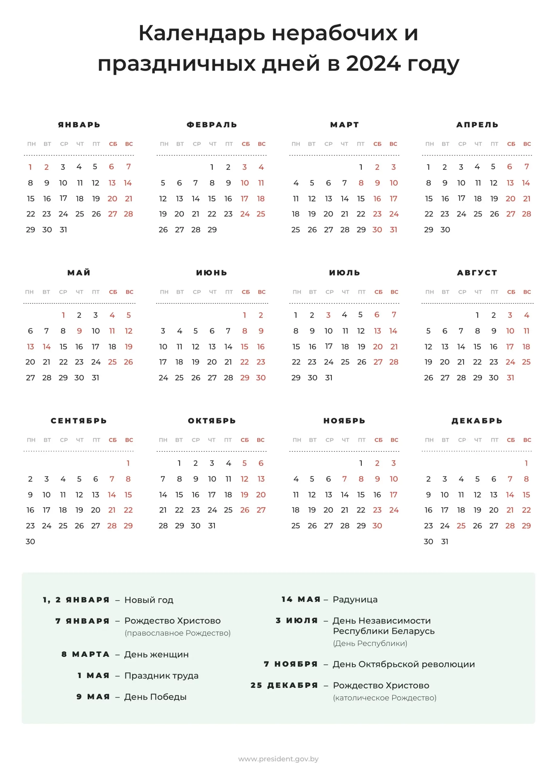 Калі яшчэ будуць выхадныя ў 2024 годзе