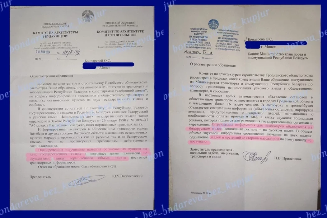 “Улічваючы, што часовы інтэрвал знаходжання транспартных сродкаў на прыпыначных пунктах нязначны (да 1 хвіліны), трансляцыя гукавой інфармацыі для пасажыраў на дзвюх мовах не ўяўляецца магчымай”, — адказаў Бондаравай Мінсктранс. Таксама там дадалі, што абвяшчэнне прыпынкаў толькі на беларускай мове не супярэчыць заканадаўству. Адказ, падобны да мінскага, жанчына атрымала з Гомельскага аблвыканкама.