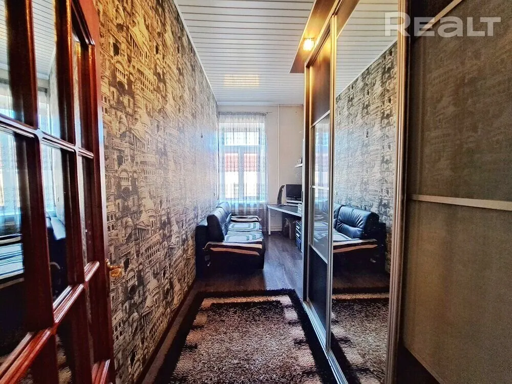 У цэнтры Гродна прадаюць двушку ў будынку 1890 года пабудовы. Тут олдскульны рамонт са скуранай канапай, люстраной чорнай столлю і ярка-чырвонай падлогай. Адзін з пакояў – прахадны. Будучаму ўласніку застаецца убудаваная мэбля.